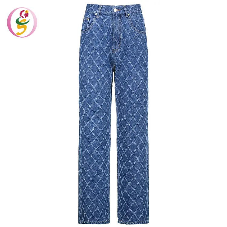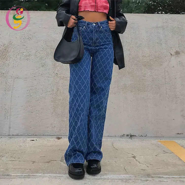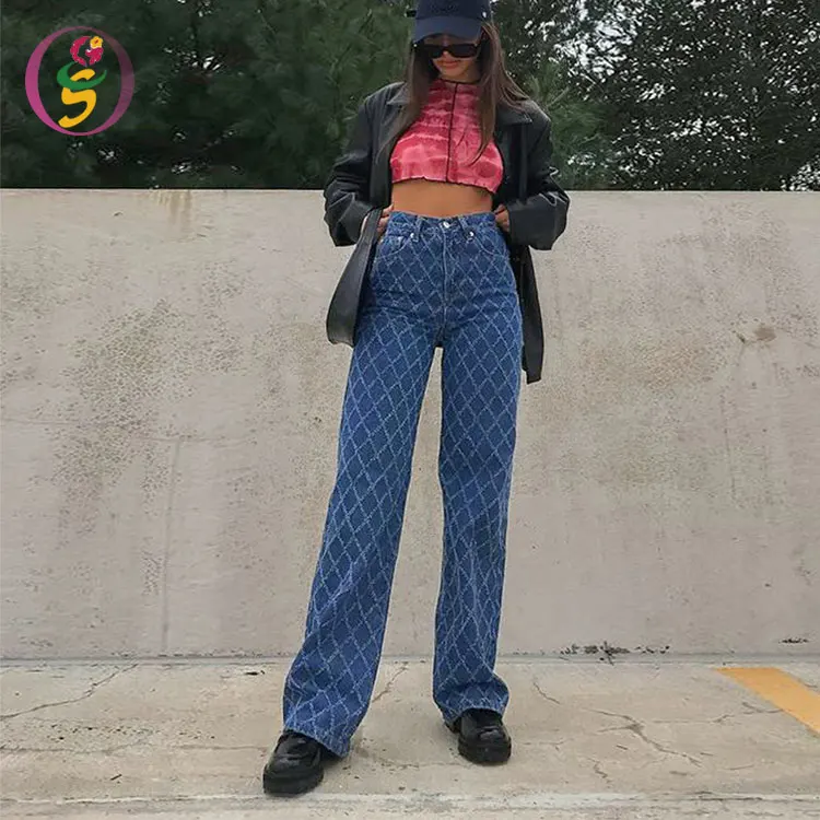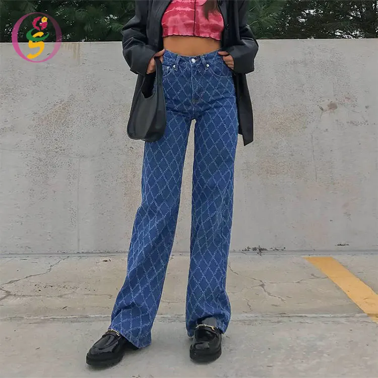 High Street Diamond Plaid Woman Jeans Straight High Waist Pants Spring Autumn New Denim Pants High Waist Wash Jeans for Women