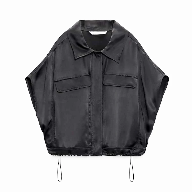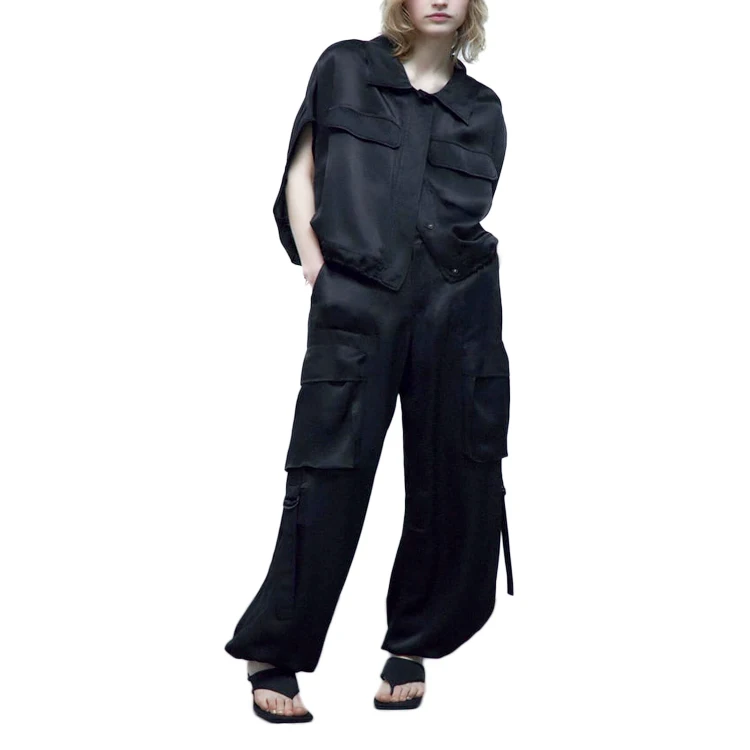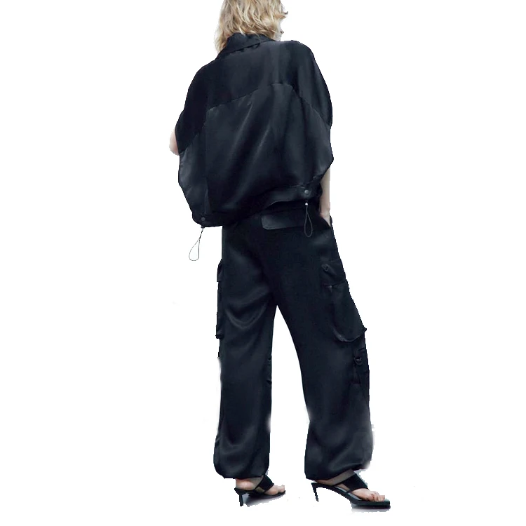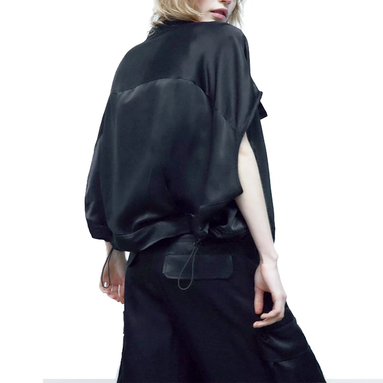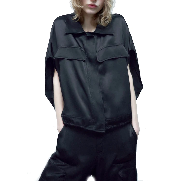 Women's Quick Dry Satin Cargo Blouse Bat Short Sleeve Shirts With Front Pocket and Adjustable Hem for Casual ,Street Wear