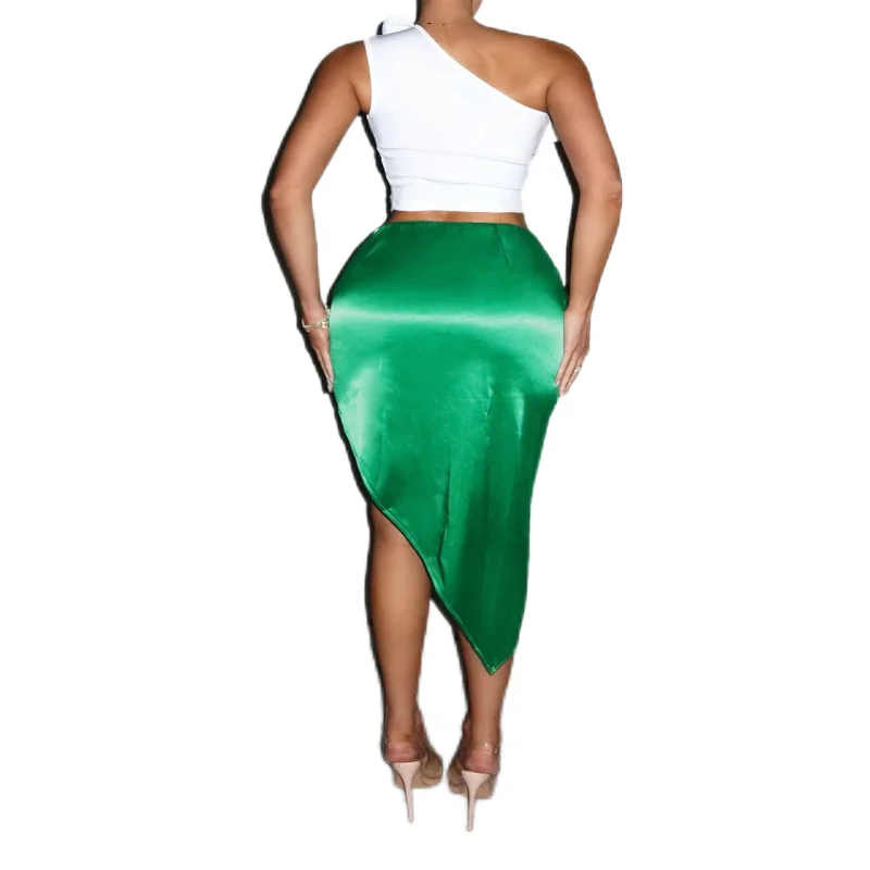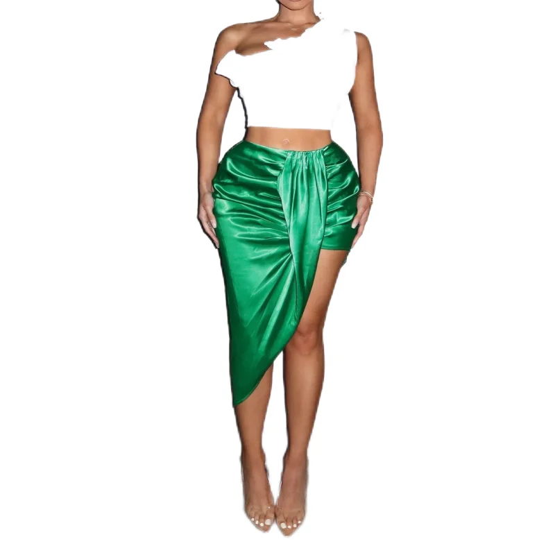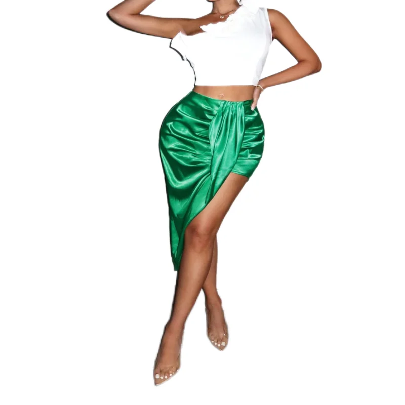 Fashion OEM Clothing Women High Waist Side Split Mini Skirts Elegant Green Asymmetric Wrap Short Satin Skirts