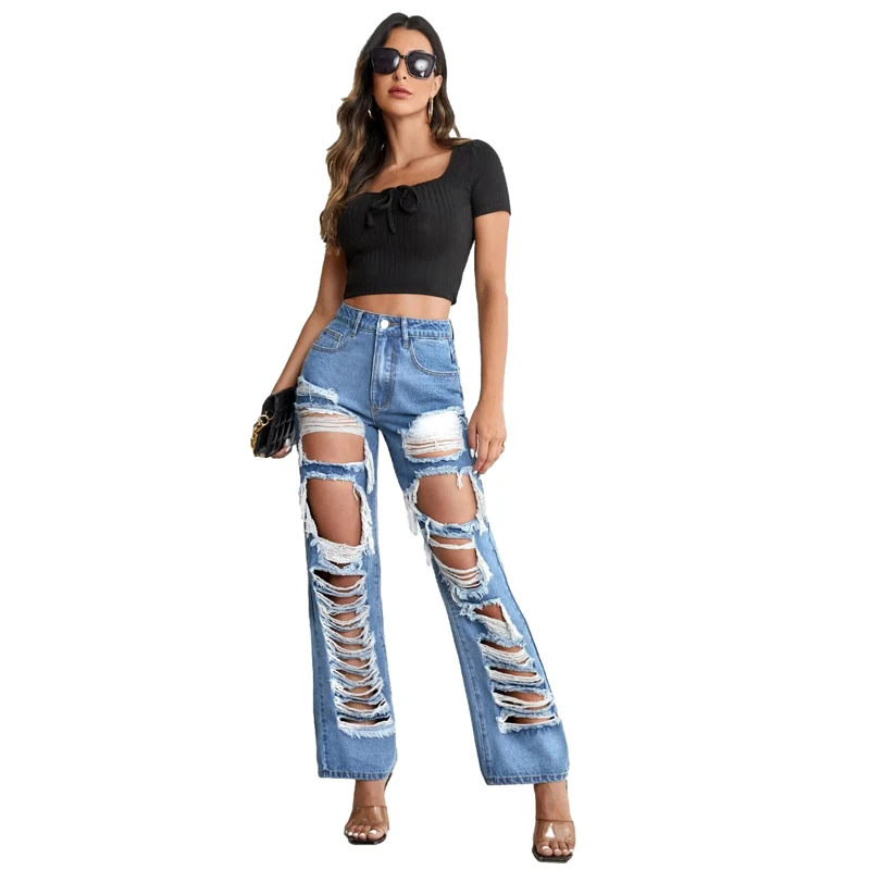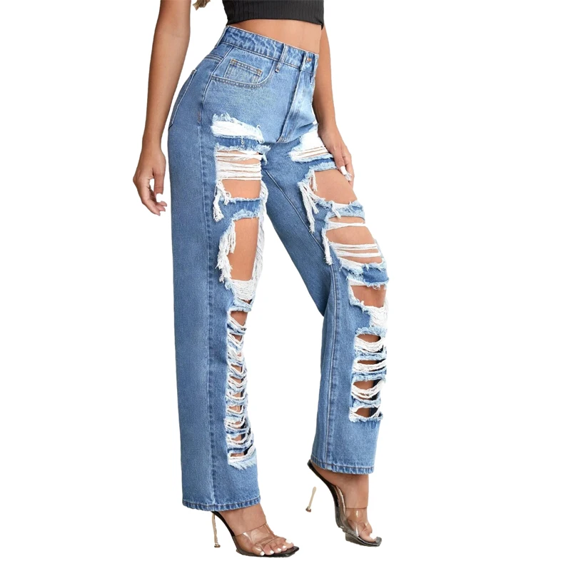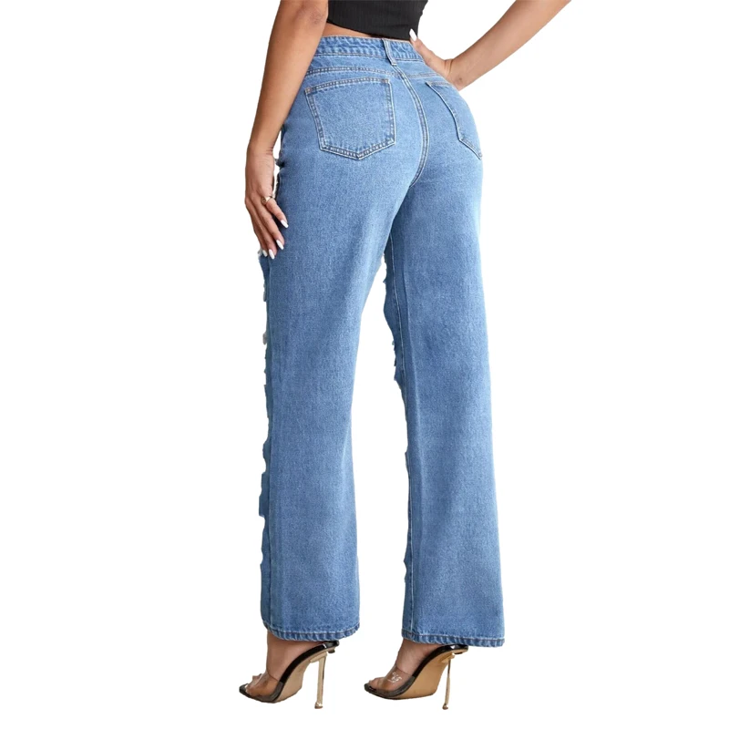 Custom Fashion High Waist Washed Holes Distressed Ripped Straight Jean for Women