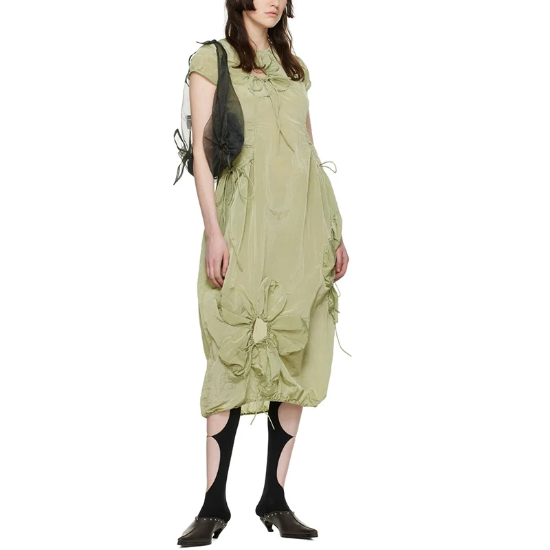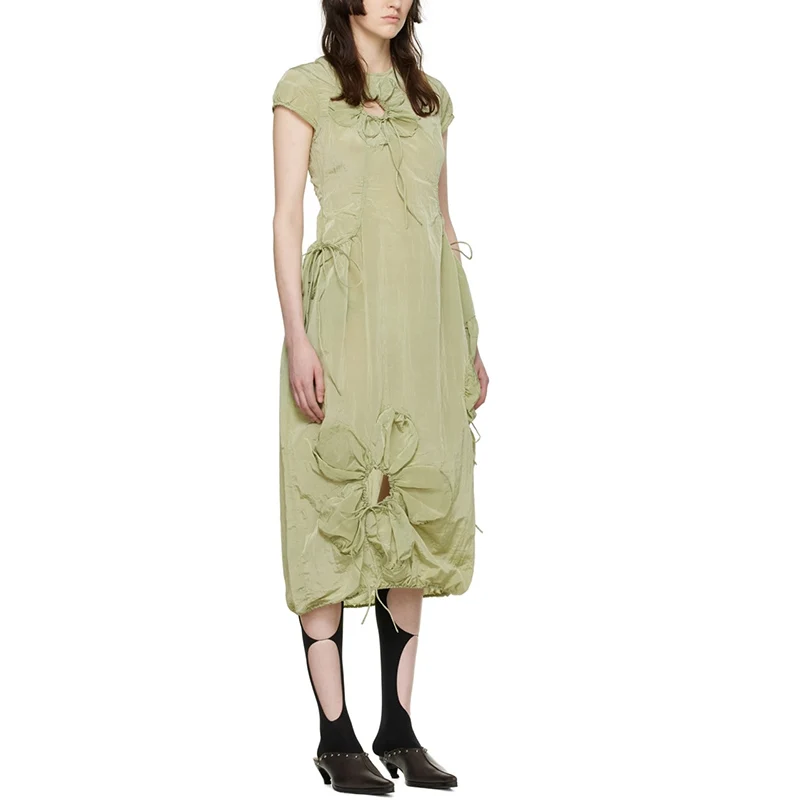 2026 Popular Custom Rubber logo Applique Floral Women Skinny Ruching Woven Dress