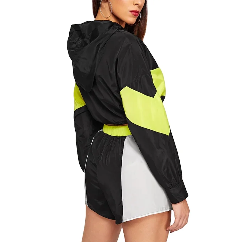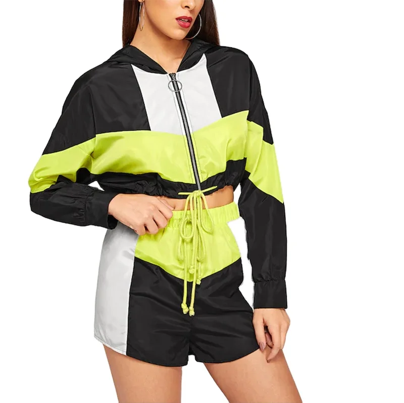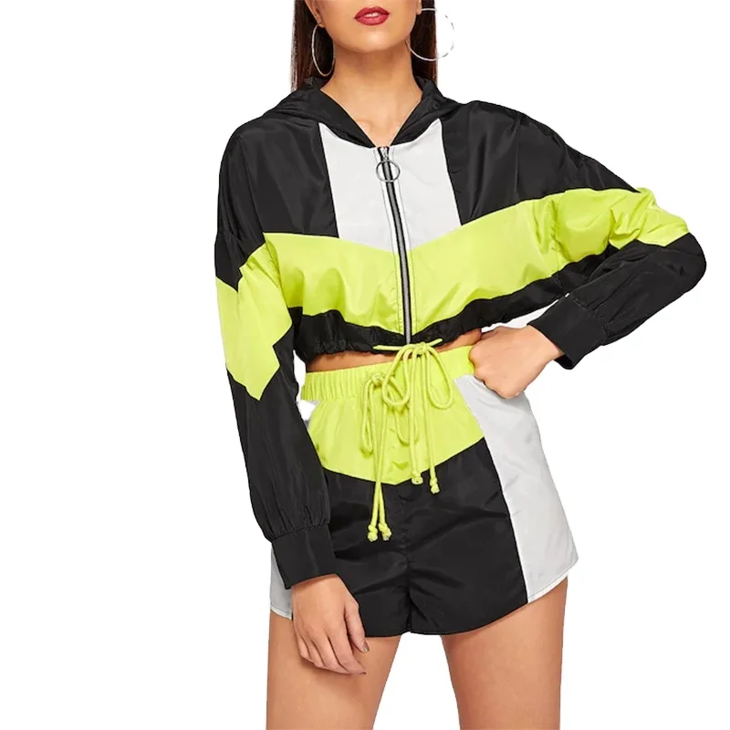 Colorblock Drawstring Hem Hooded Jacket and Shorts Set Ladies Sporty Multicolor Windbreaker Sweatsuit