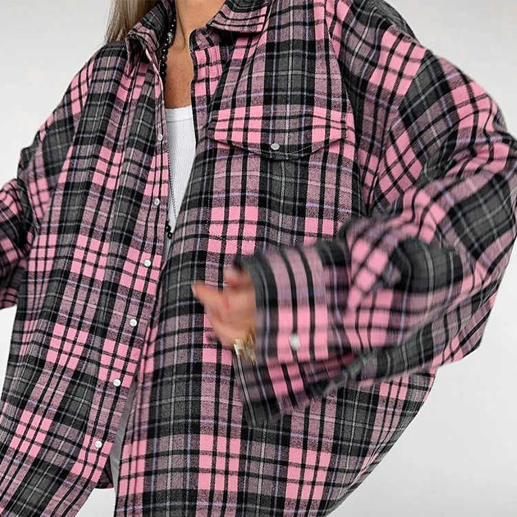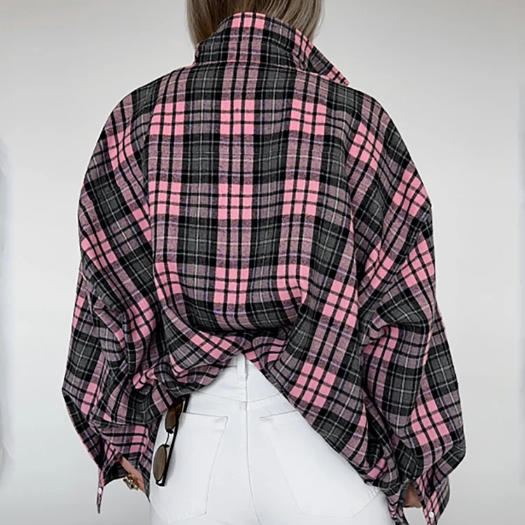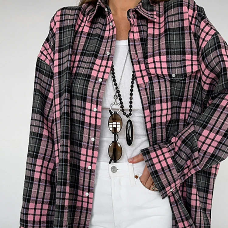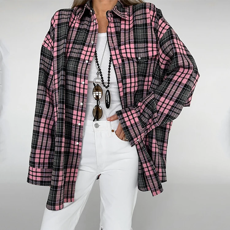 Fashion Women's Oversized Lapel Long Sleeve Plaid Button Shirt