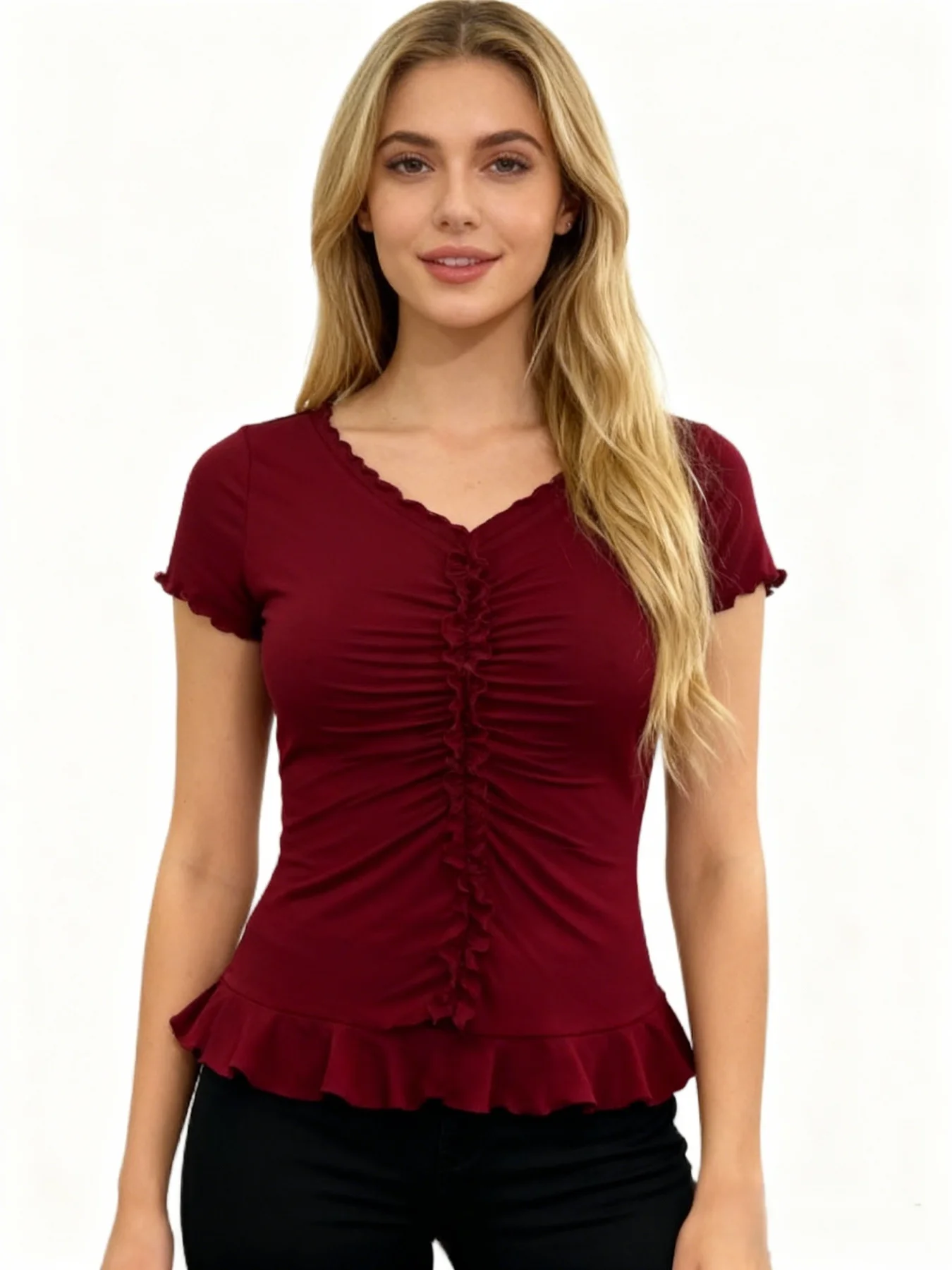 High Quality Fashion V Neck Short Sleeves Cuff/Bottom Edge Scalloped Details Ruched Ruffle Design Elegant Crop Tops