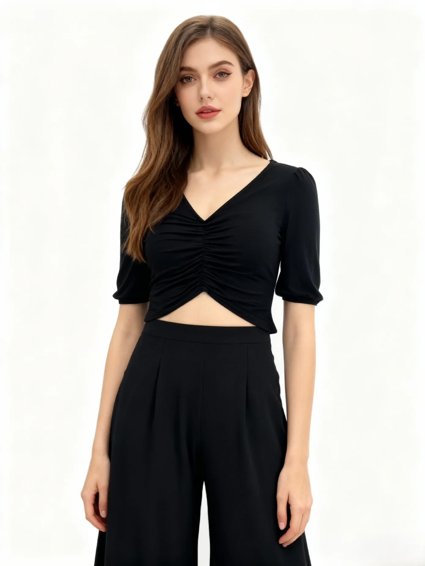 Elegant Slim Fit Shirt Summer Soft Stretch Fashionable Hiking Front Ruched Elbow Sleeves V Neck Crop Tops