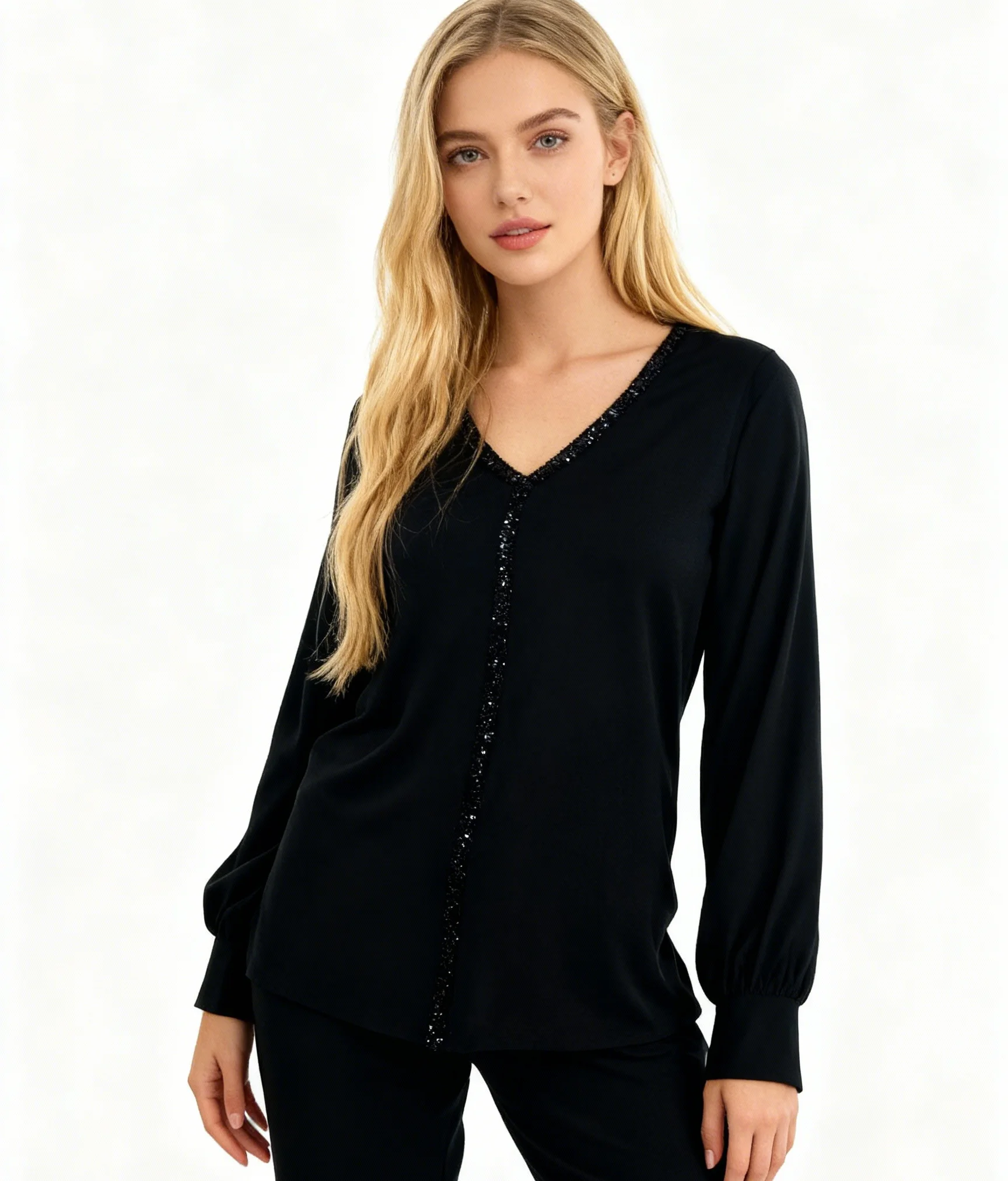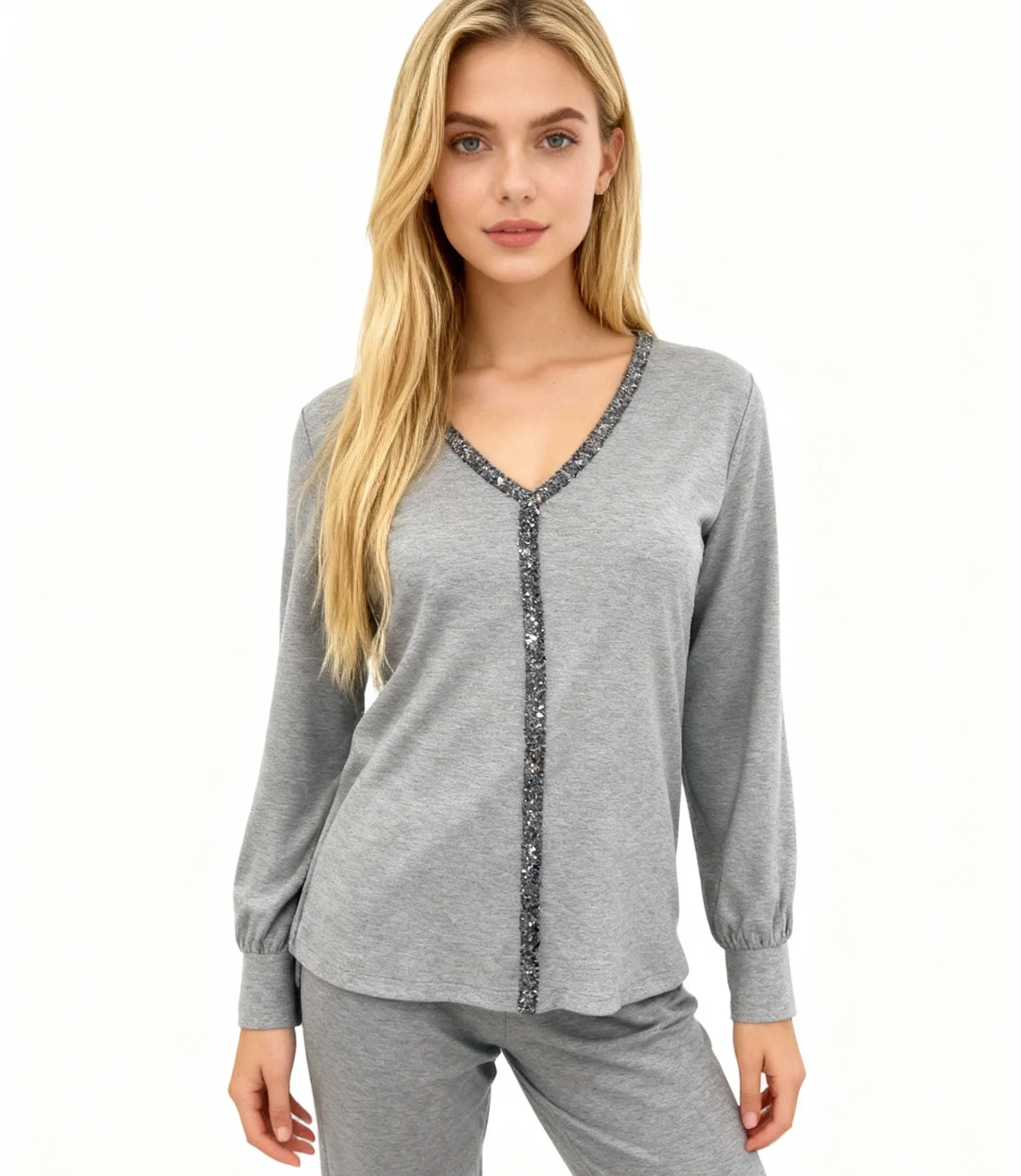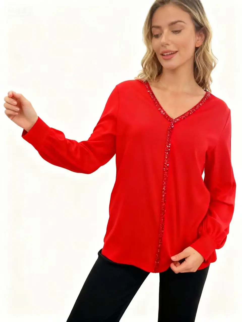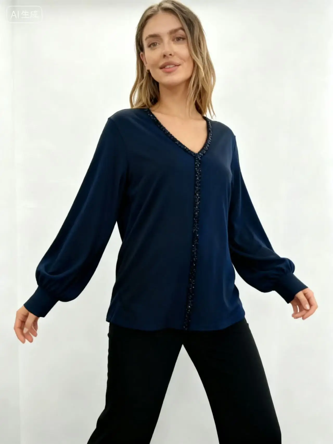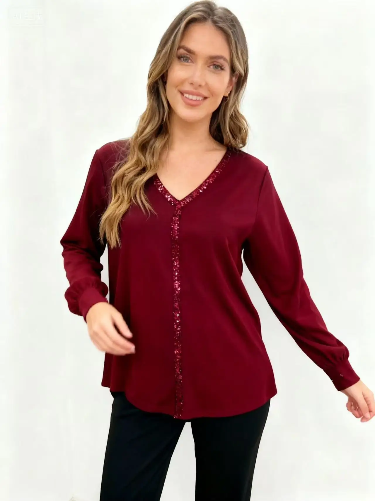 Women's Spring/Autumn Knitted Soft Stretch High Quality Fashion V Neck Sequins on Front+CF Long Sleeve Pullover Plus Size TOP