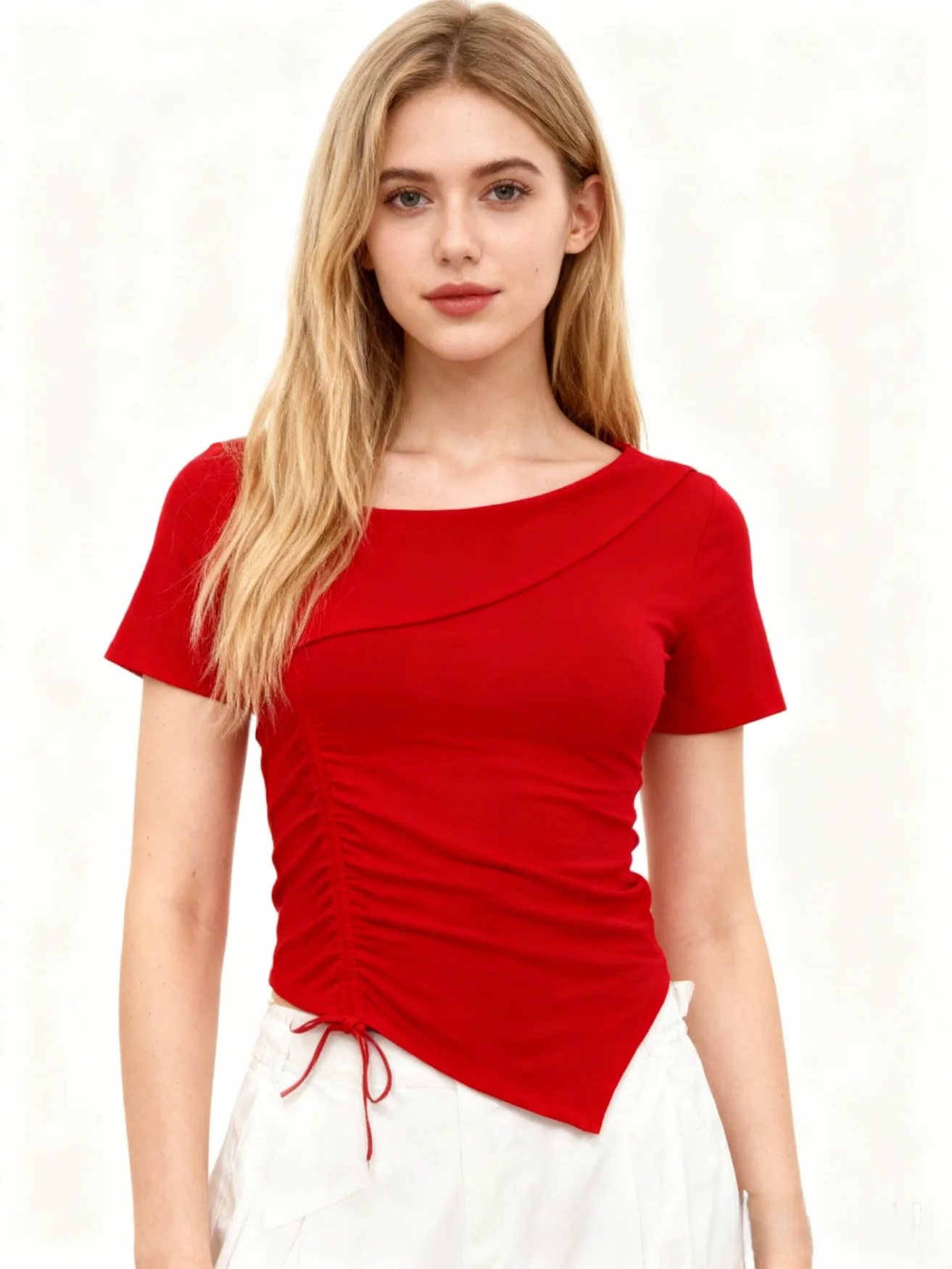 High Quality Fashion Asymmetrical Cross Neck Elegant Cropped Shirts Slim Fit Tie Ruched Shirring Design Shirt Women