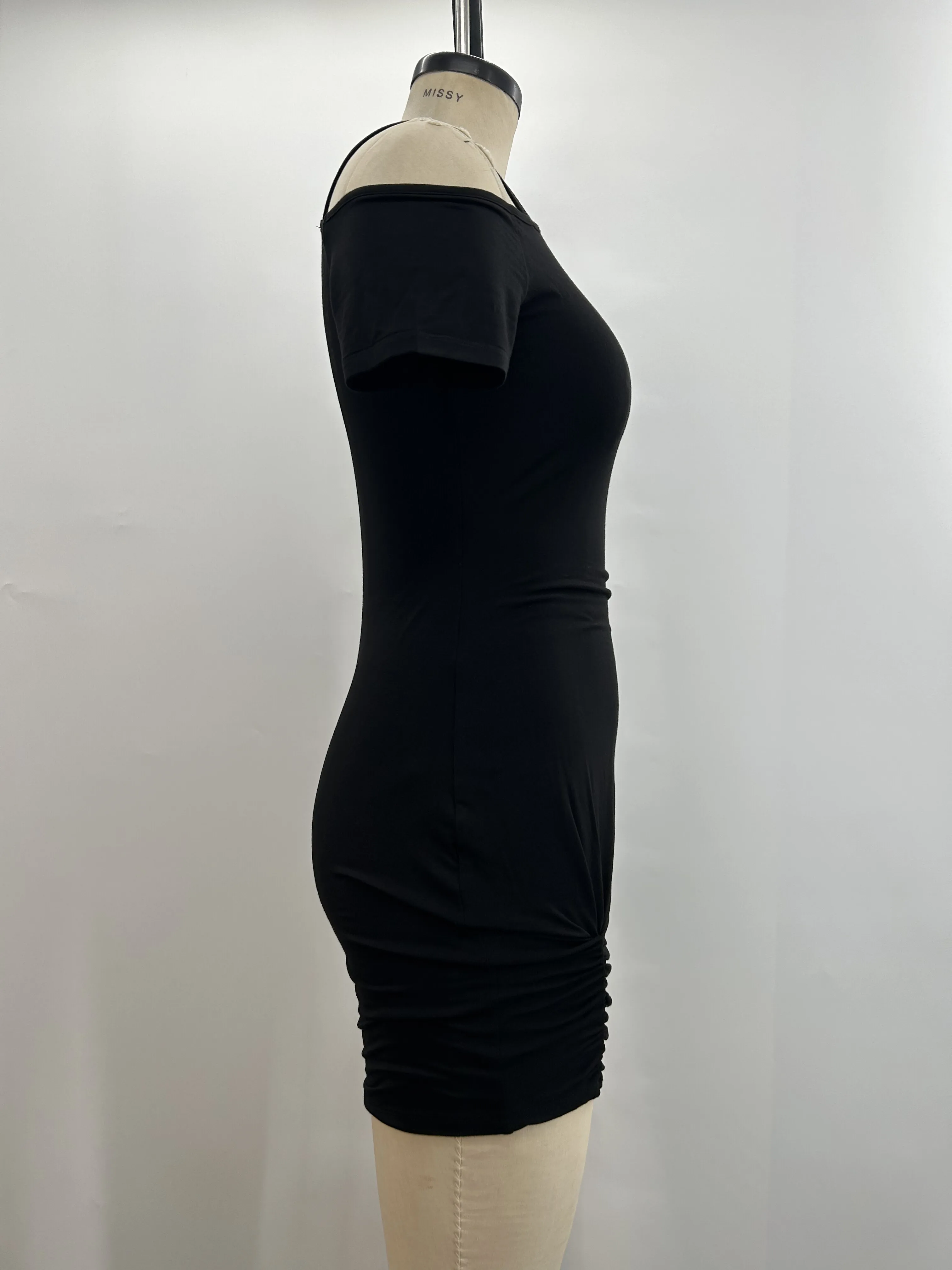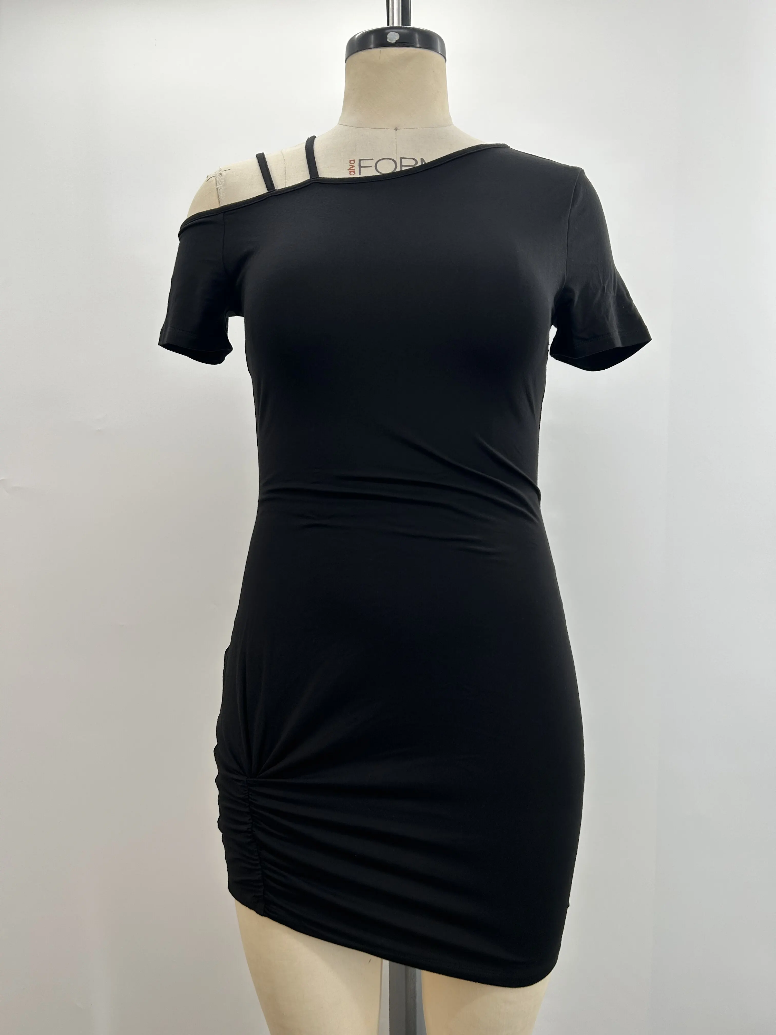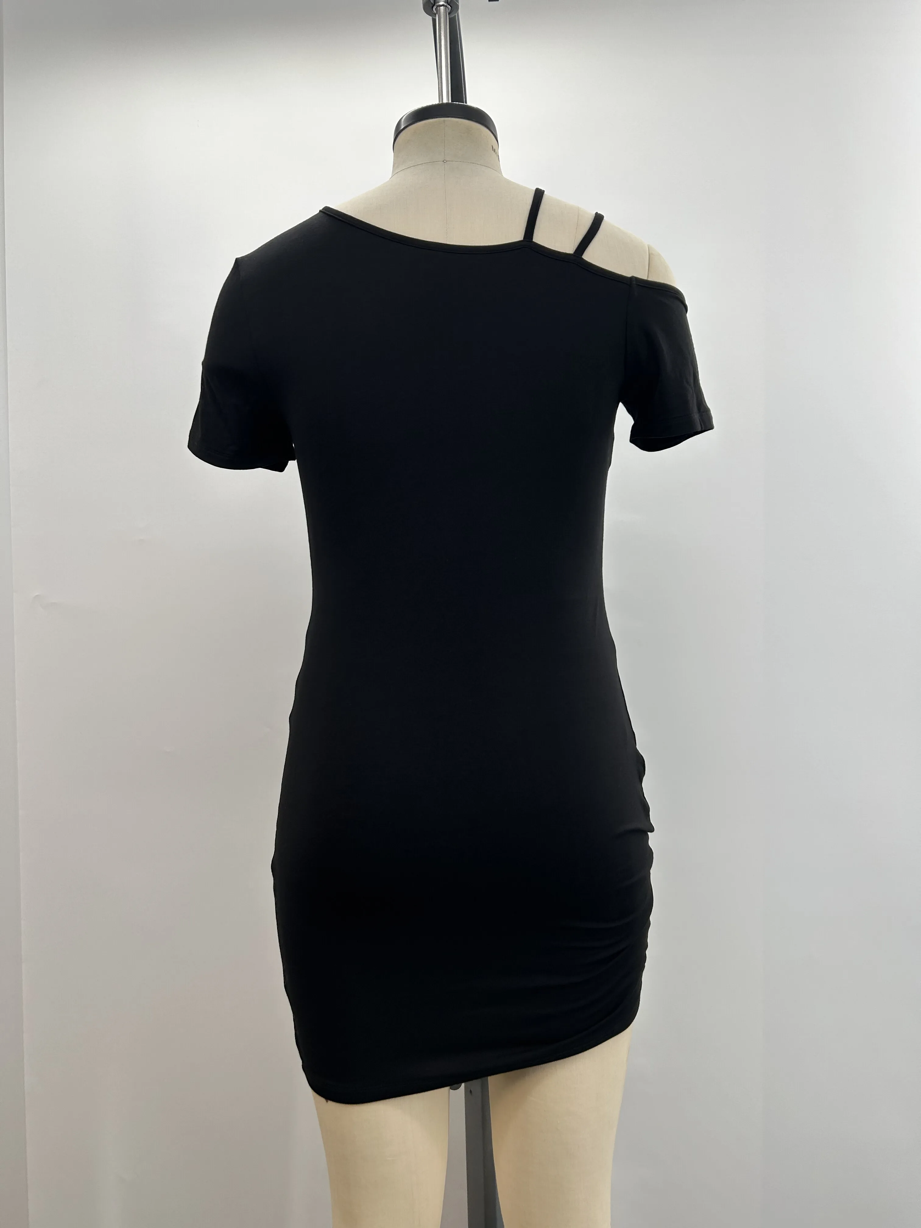 Women's Black Bodycon Hip-Hugging Short-Sleeve Dress Asymmetrical Strap Off-Shoulder with Elastic Waist Elegant Fashion Style