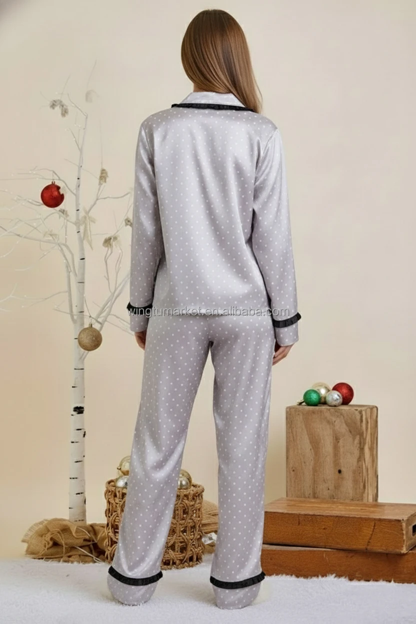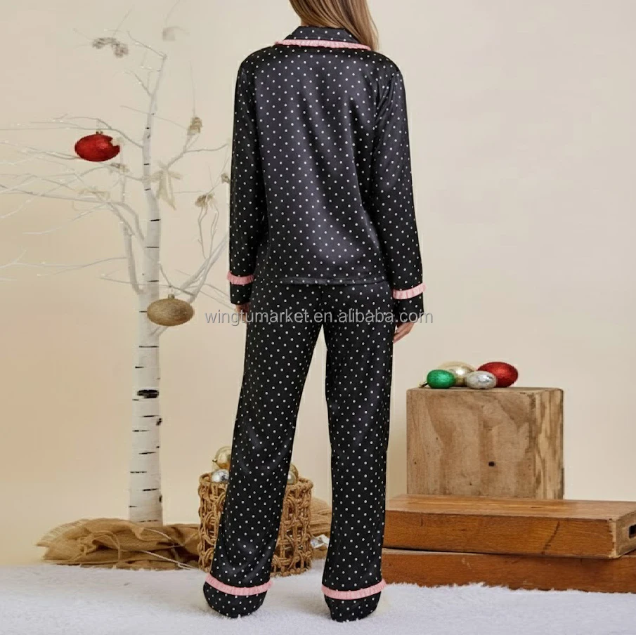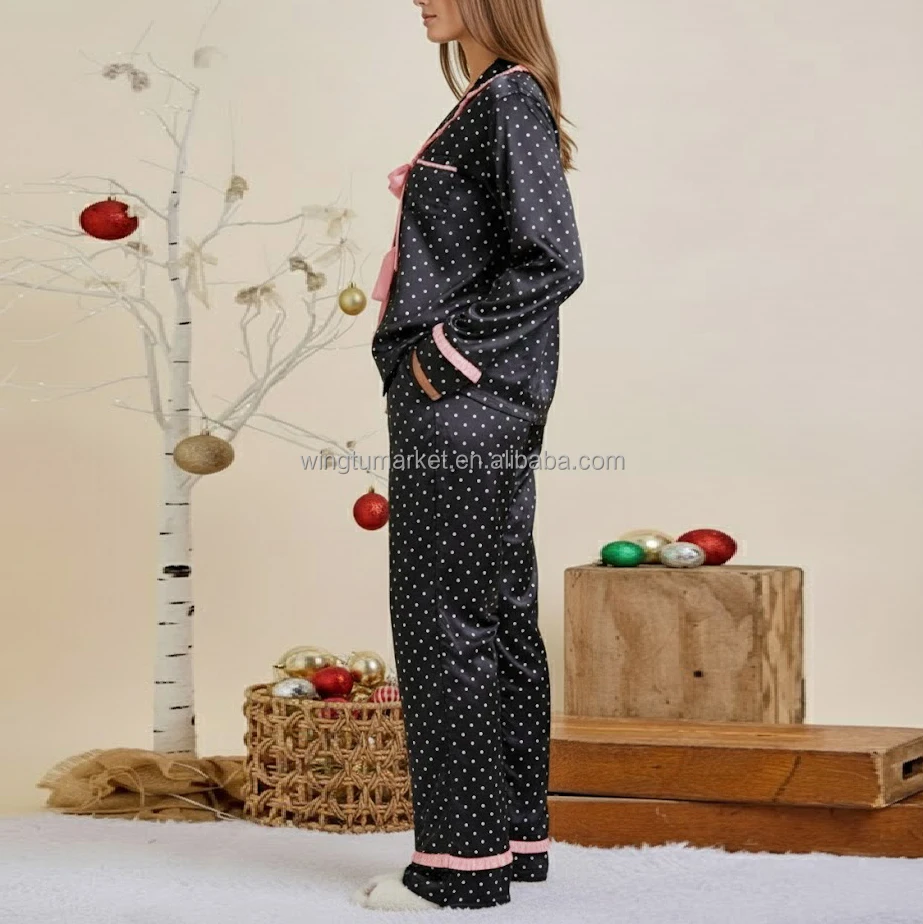 Trendy Festive Black Polka Dot Loungewear Set Pink Ribbon Bow Detail Satin Pajamas Two Piece
