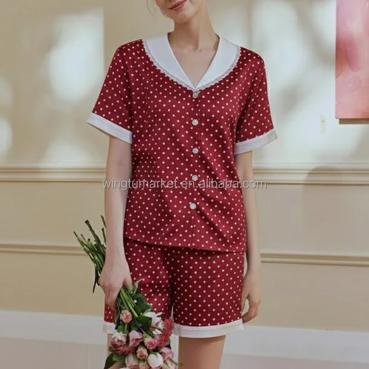Trendy Summer Breathable Polka Dot Print Sleepwear Two Piece Set Button-up Top Shorts for Women