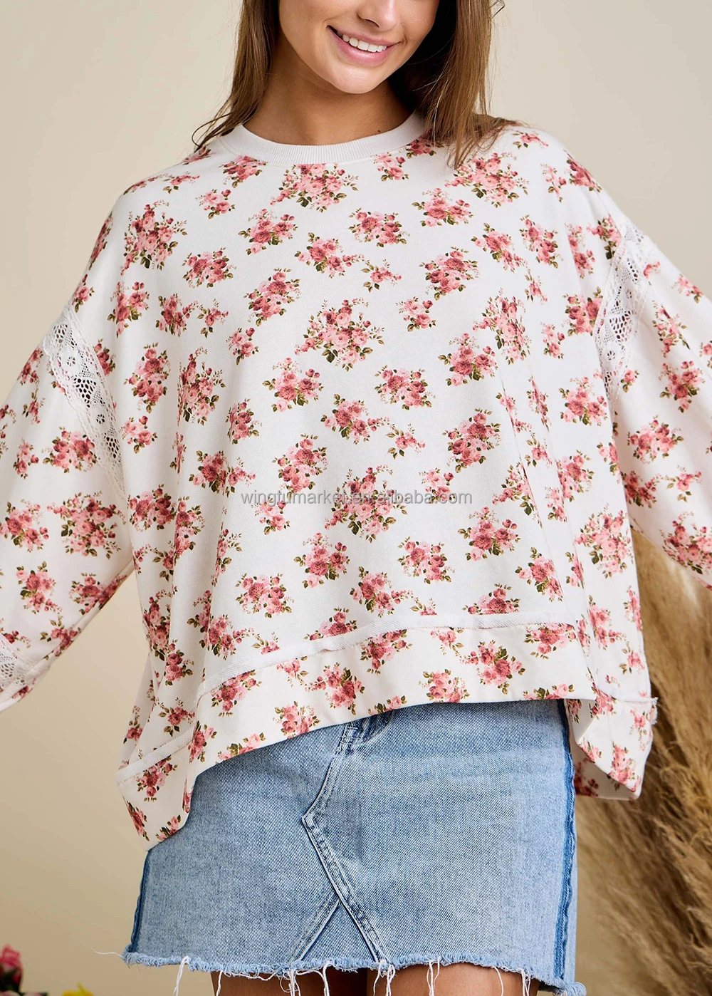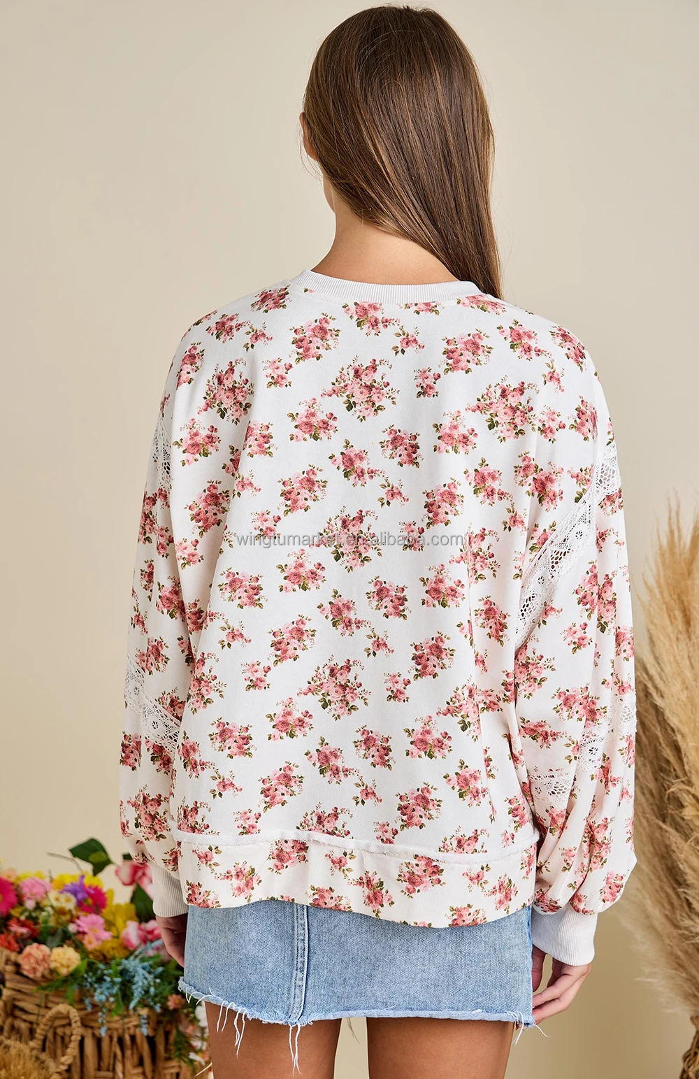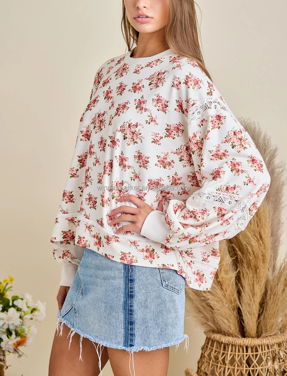 Wholesale Pullover Vintage Floral Print Lace Insert Puff Sleeve Crew Neck Women Sweatshirt