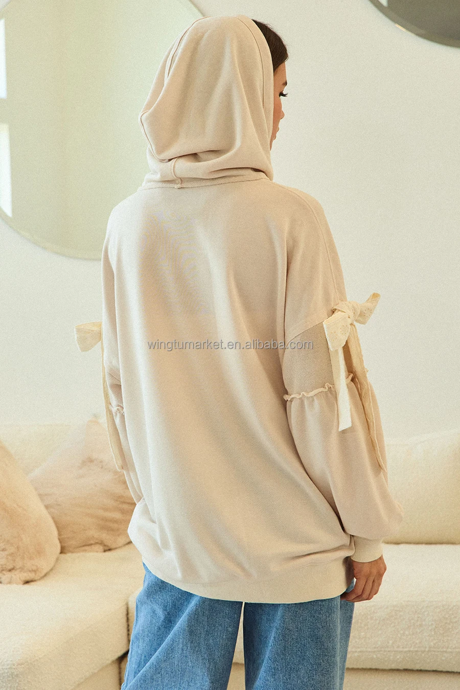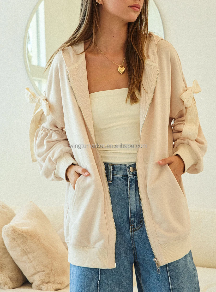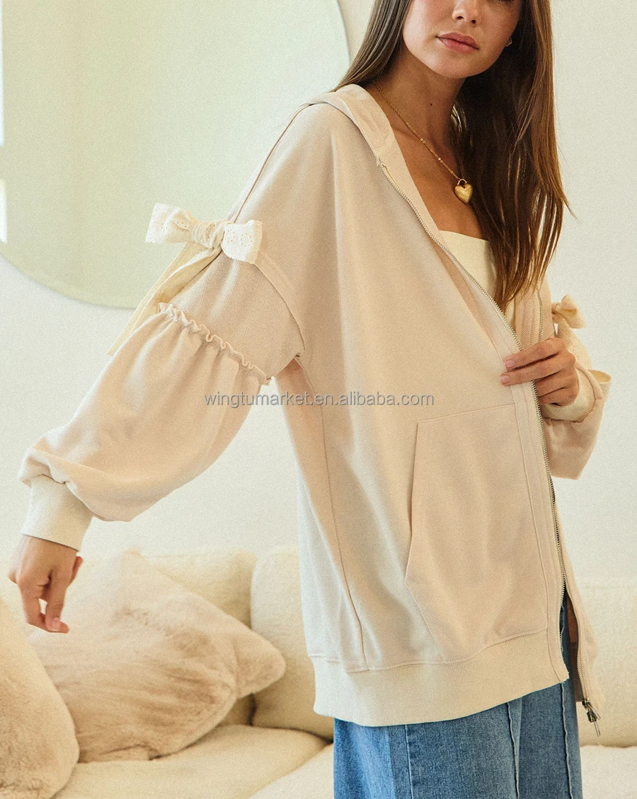 Wholesale Women Sweatshirt American Style Cream Oversized Zip up Hoodie with Sleeve Bow