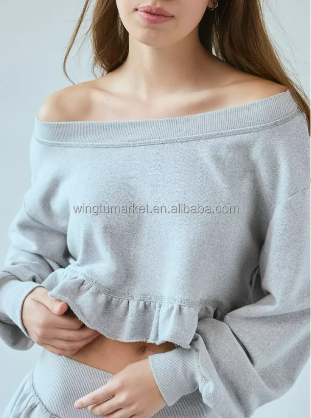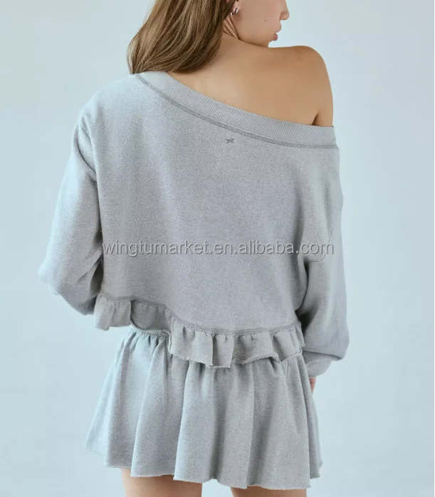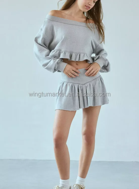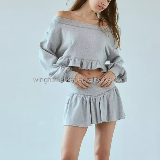 Wholesale Sexy Off Shoulder Long Sleeve Ruffle Crop Top Flared Mini Skirt Grey Two Piece Sweatsuit Women Skirt Set