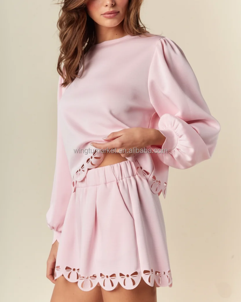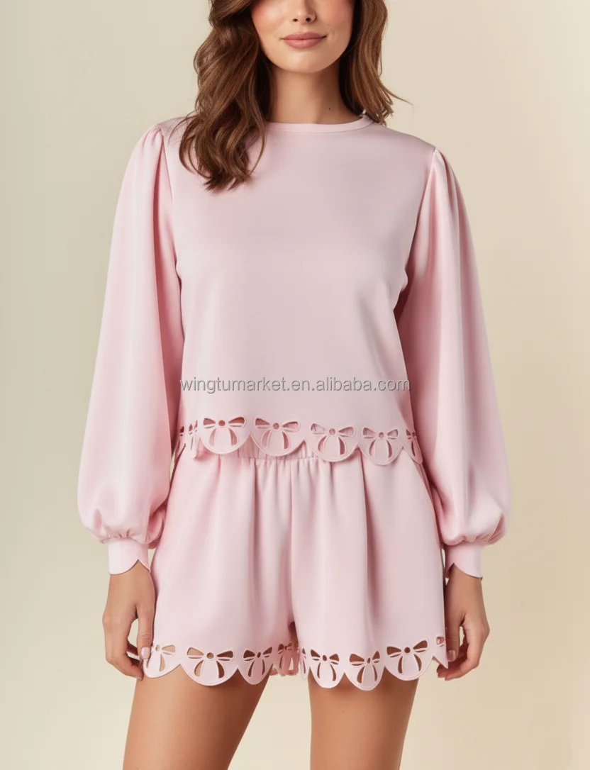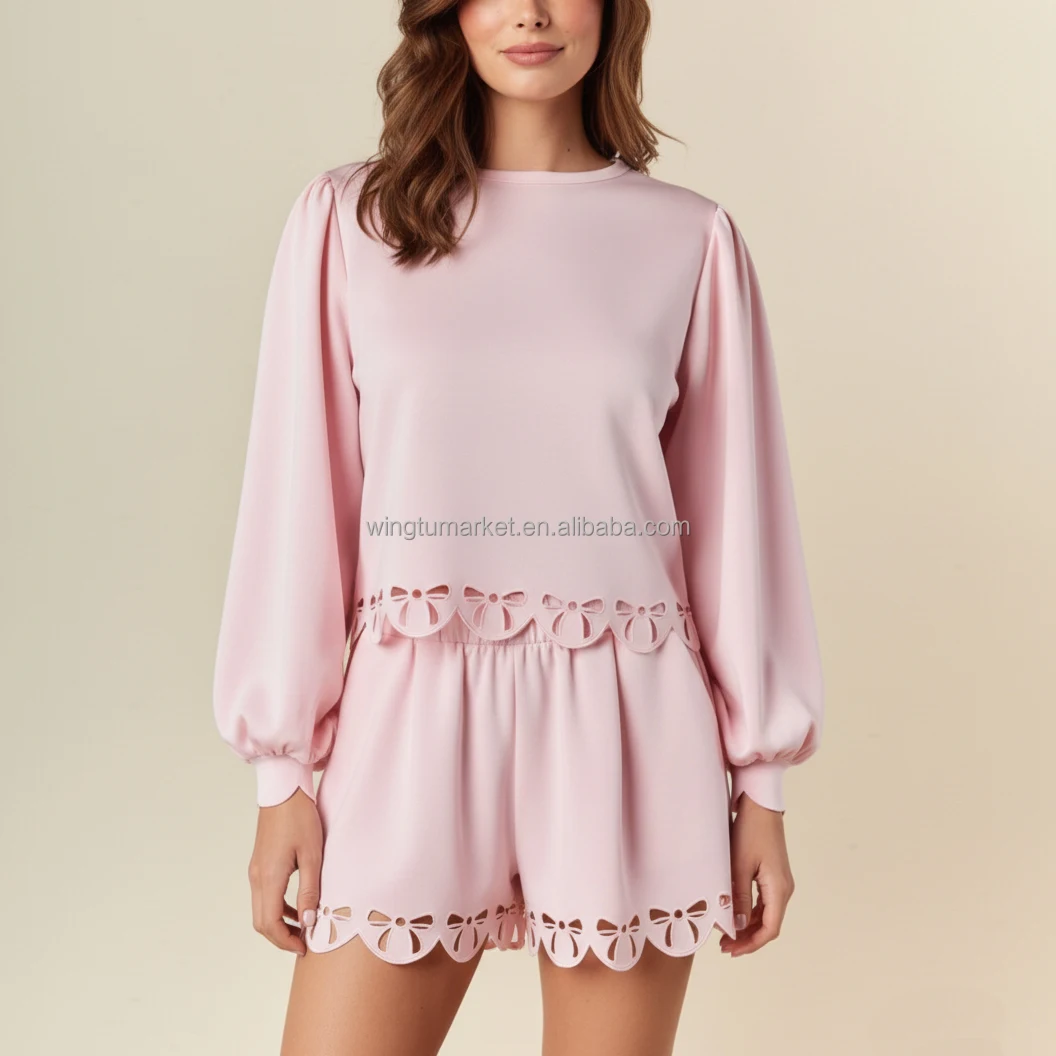 Women Pink Bow Cutout Loungewear Two Piece Short Set Cute Long Puff Sleeve Top Shorts Outfit with Laser Cut Scalloped Hem