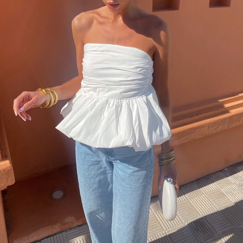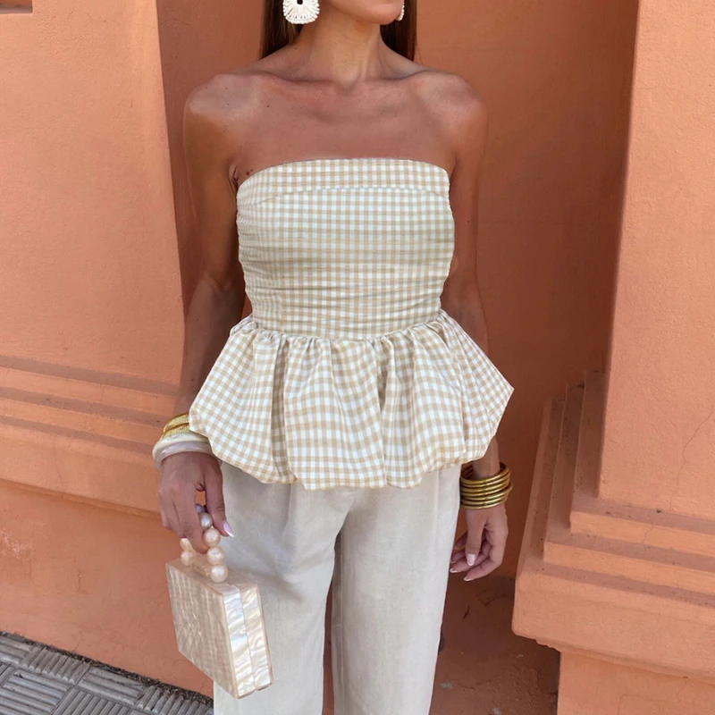Women Pink Gingham Tube Top Strapless Peplum Hem Bandeau Shirt Plaid Check Summer Blouse for Picnic Party