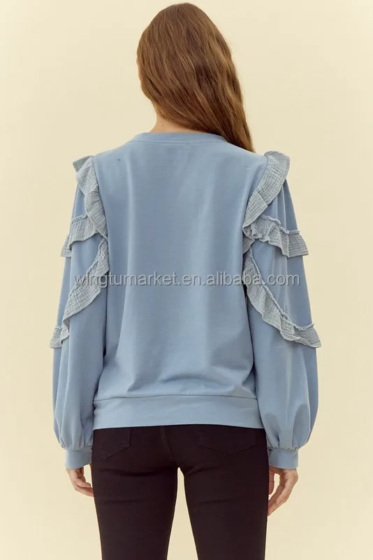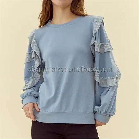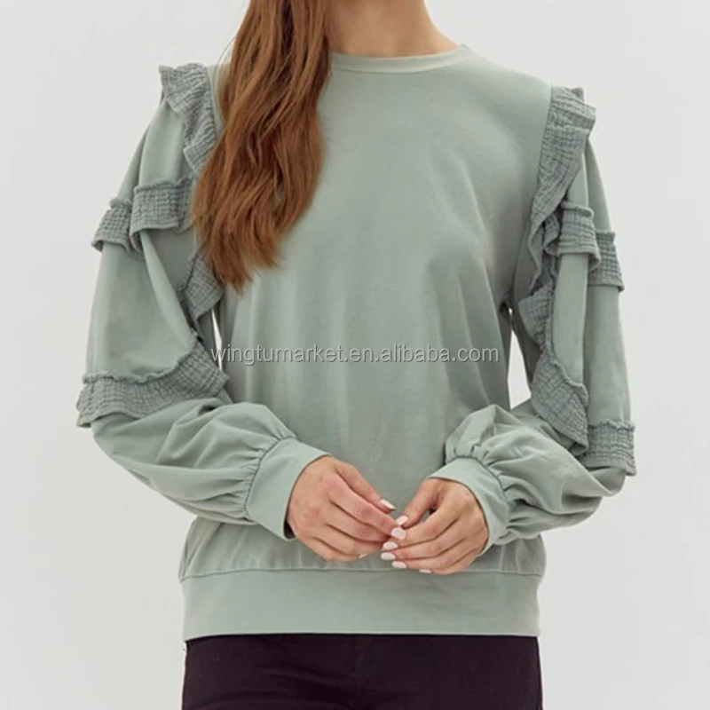 Women Hot Pink Ruffle Sleeve Sweatshirt Casual Crew Neck Tiered Ruffled Pullover Top with Raw Edge