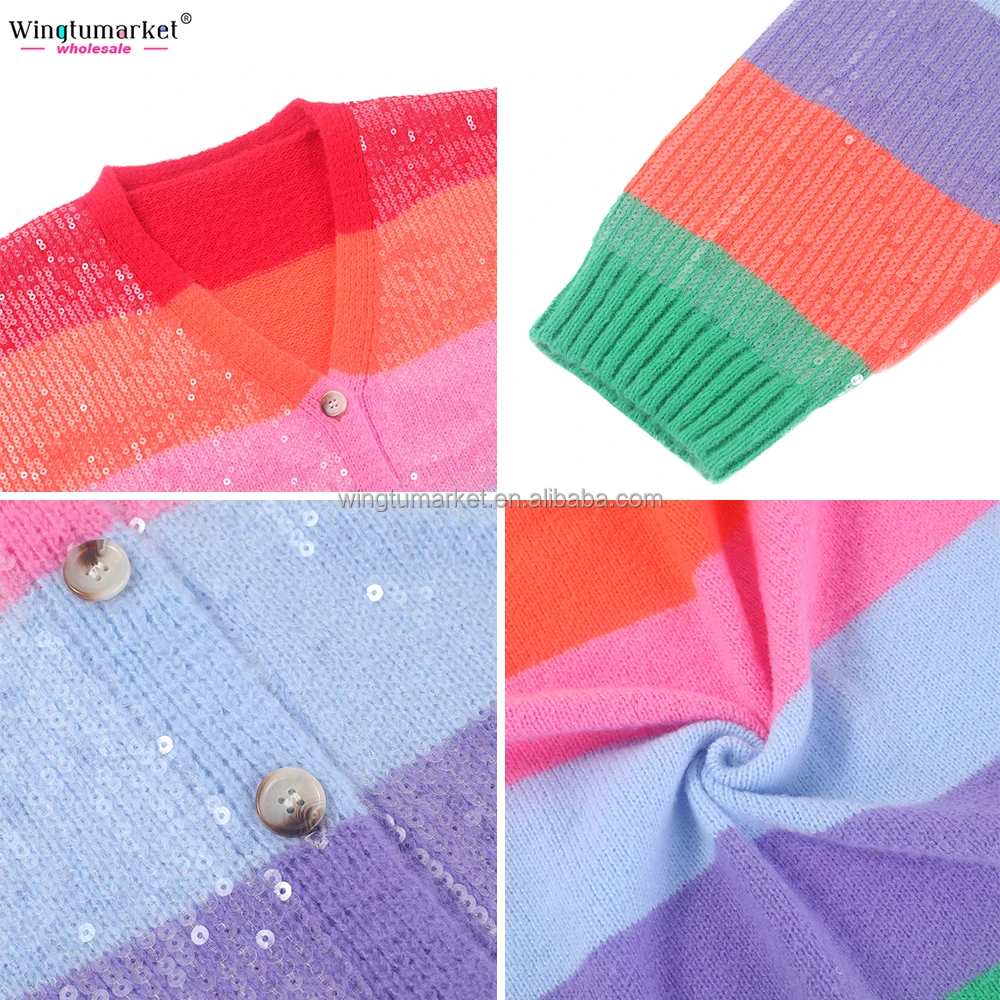 Women Rainbow Striped Sequin Cardigan Color Block V Neck Button Down Knit Sweater Coat with Sparkle