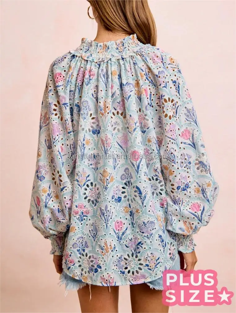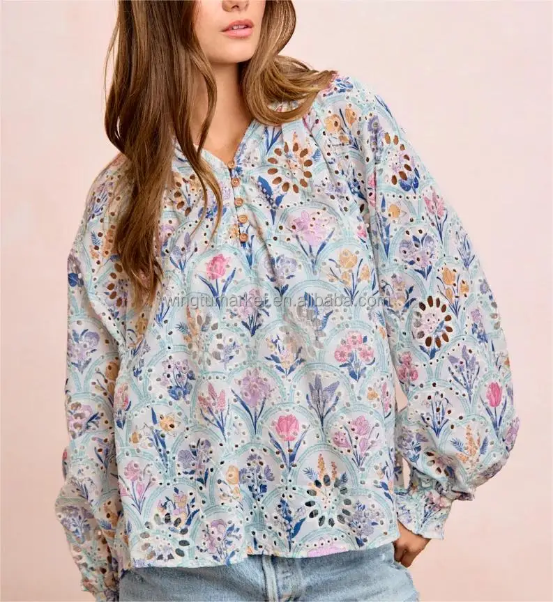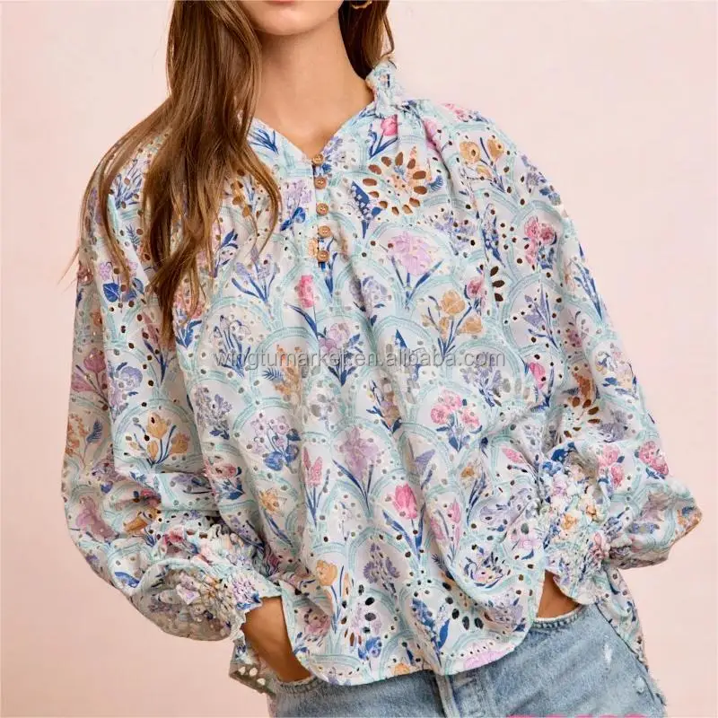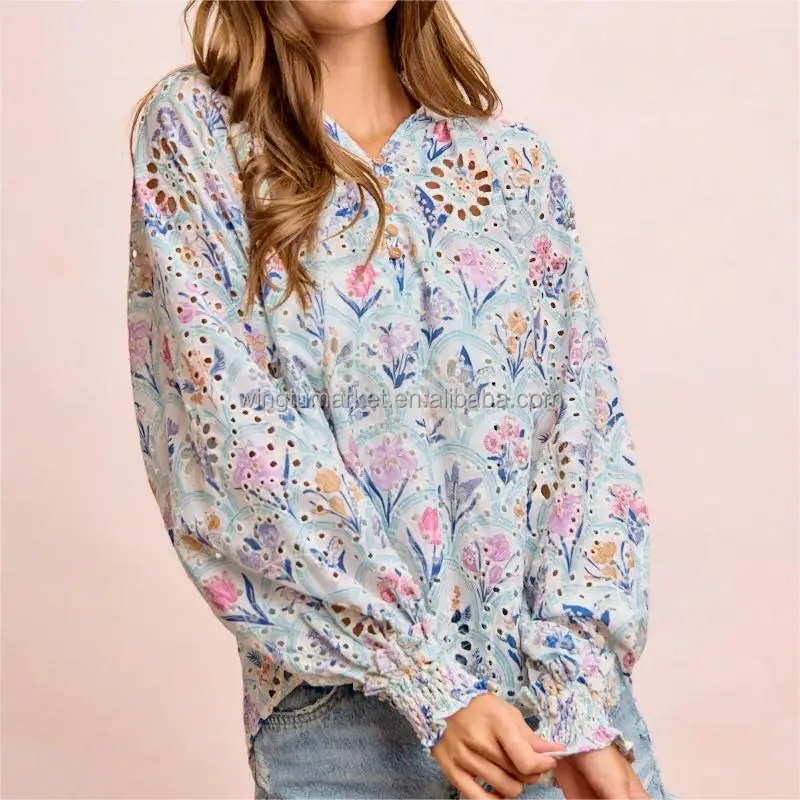 Women Boho Floral Eyelet Blouse Long Sleeve Vintage Print V Neck Button Down Shirt with Smocked Cuffs