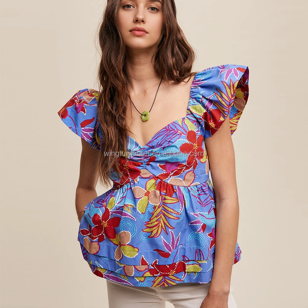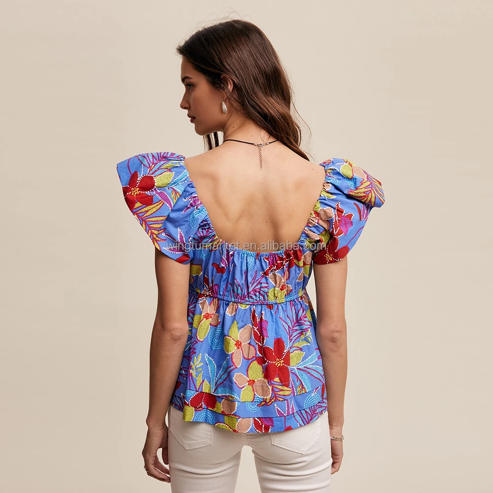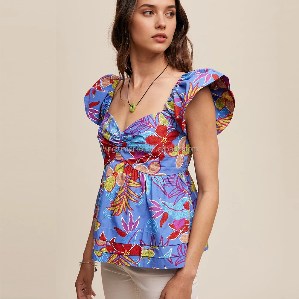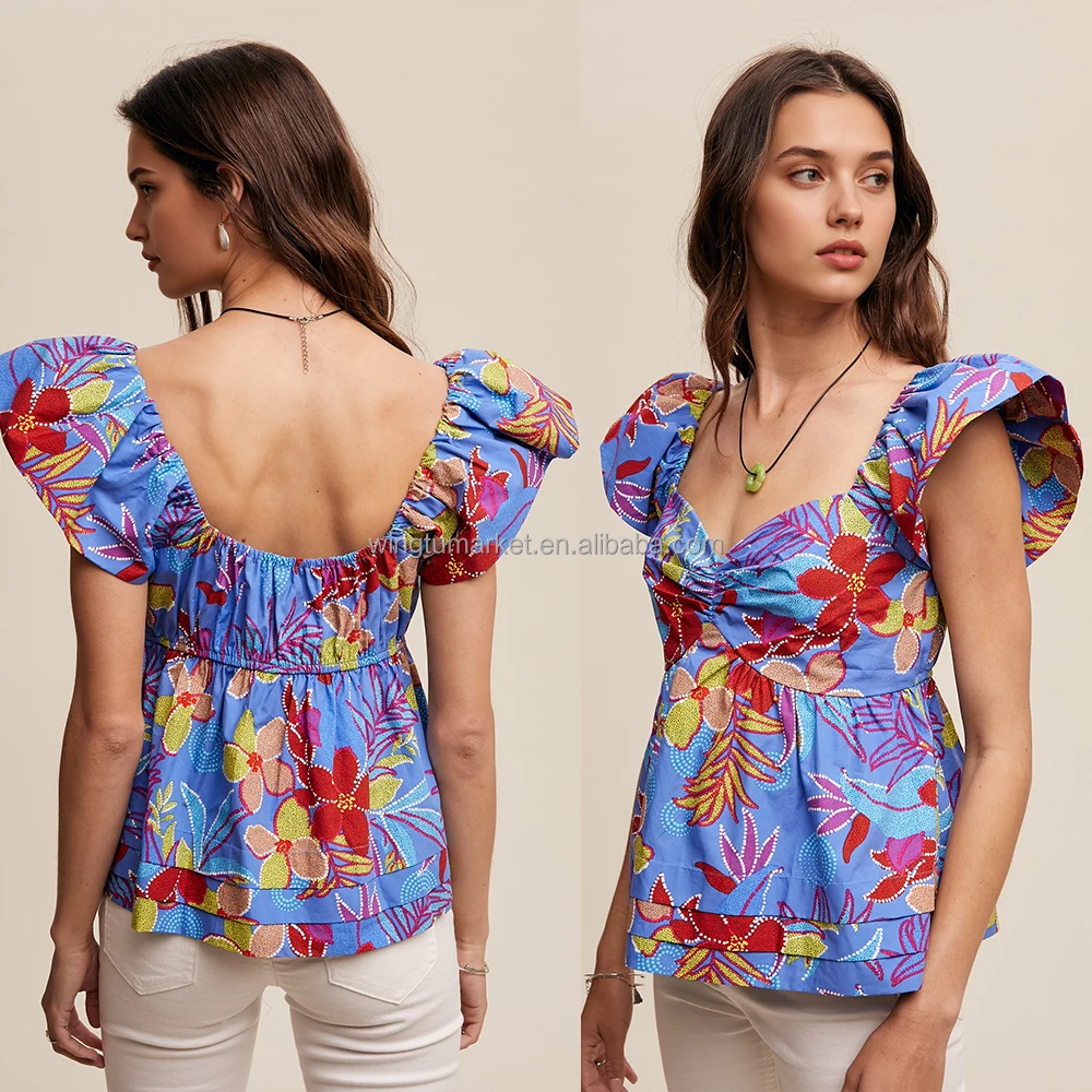Summer Elegant Backless Flower Print Cinched Sweetheart Blouse Women