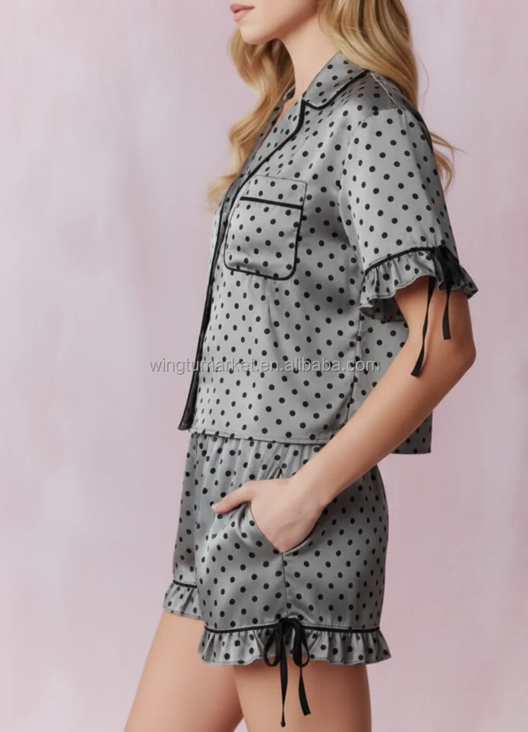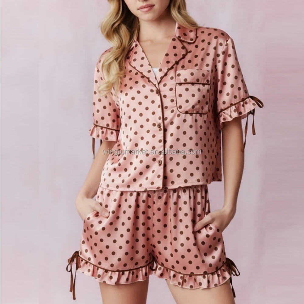 Short Sleeve Pajama Set Collar Shirt Top Shorts Dot Print Ruffle Sleepwear Women