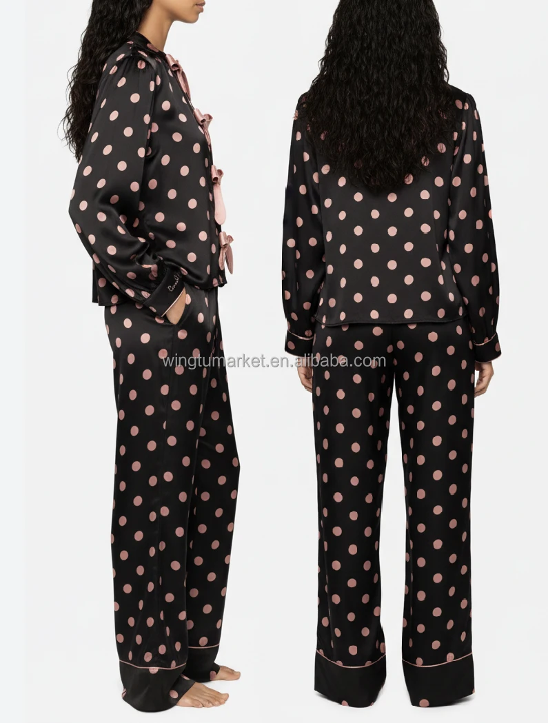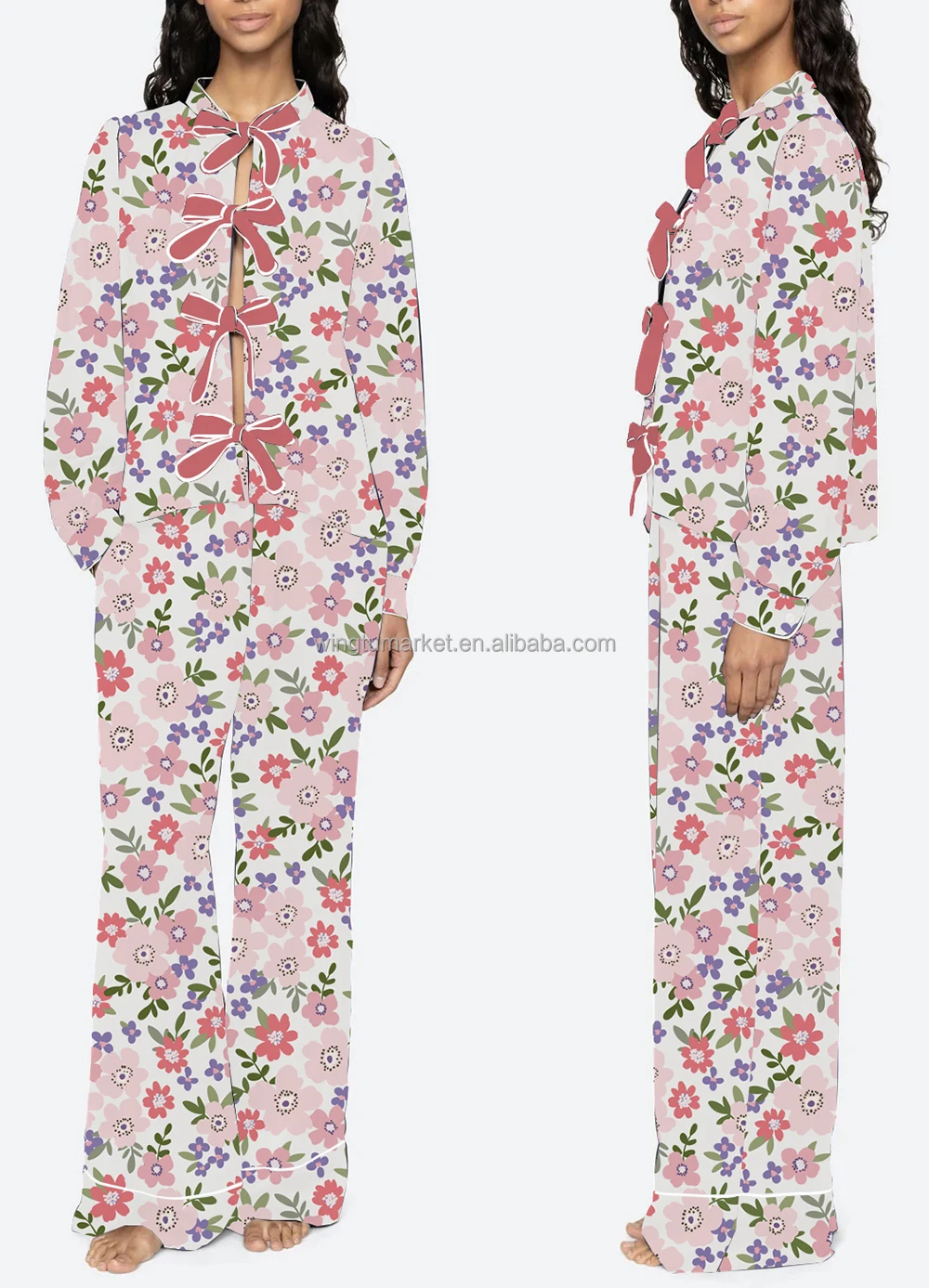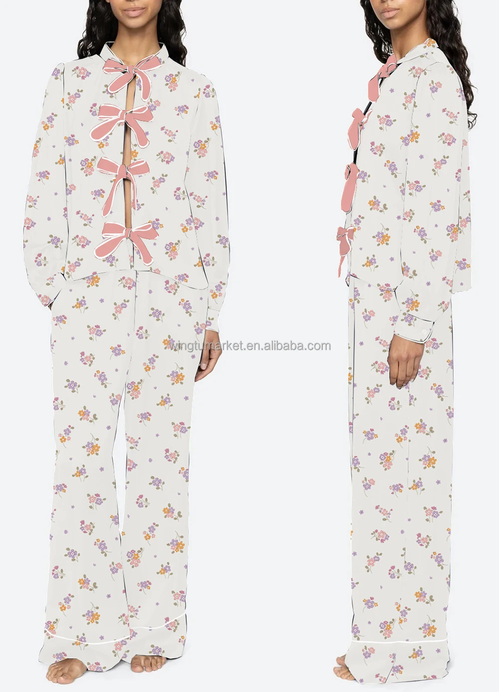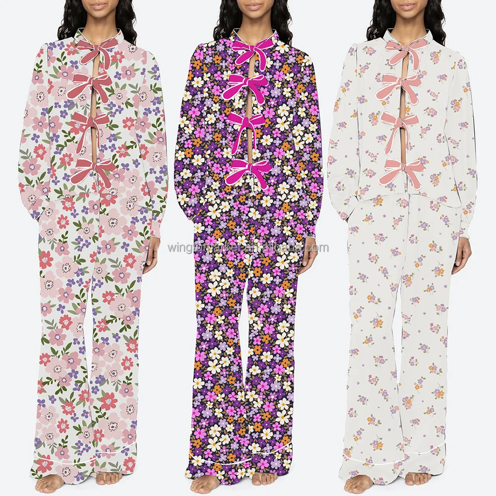 Cute Loose Floral Print Pajama Set Bow Front Cardigan Top White Piping Long Pants Sleepwear Women