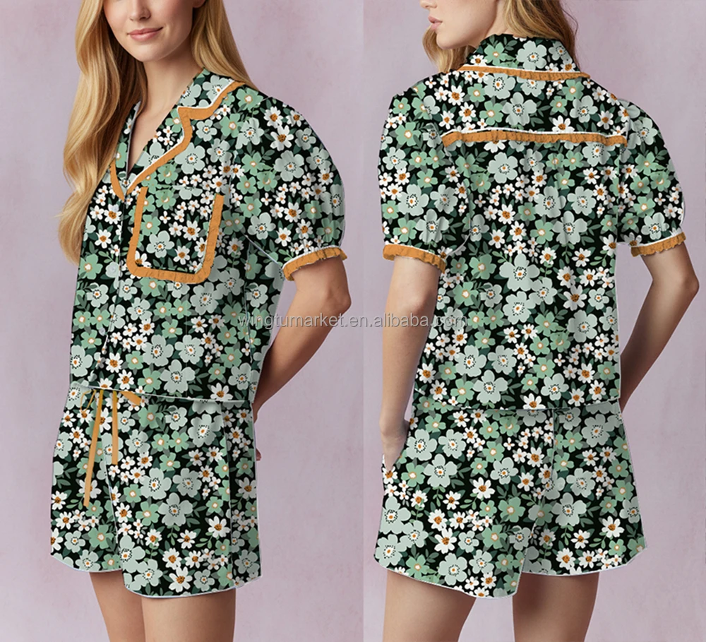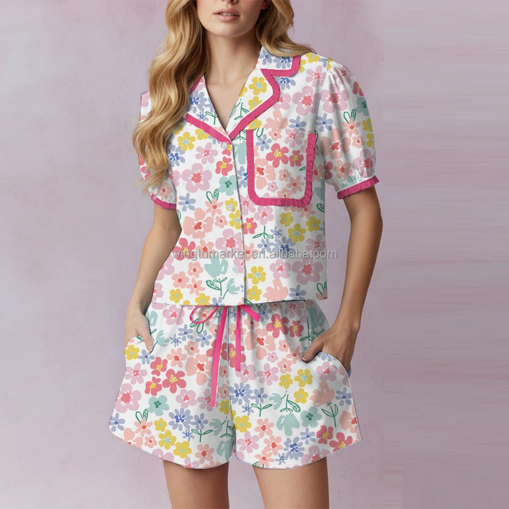 Summer Floral Print Loungewear Short Sleeve Puff Collar Top Drawstring Shorts Ruffle Edge Cute Loose Pajama Set Women