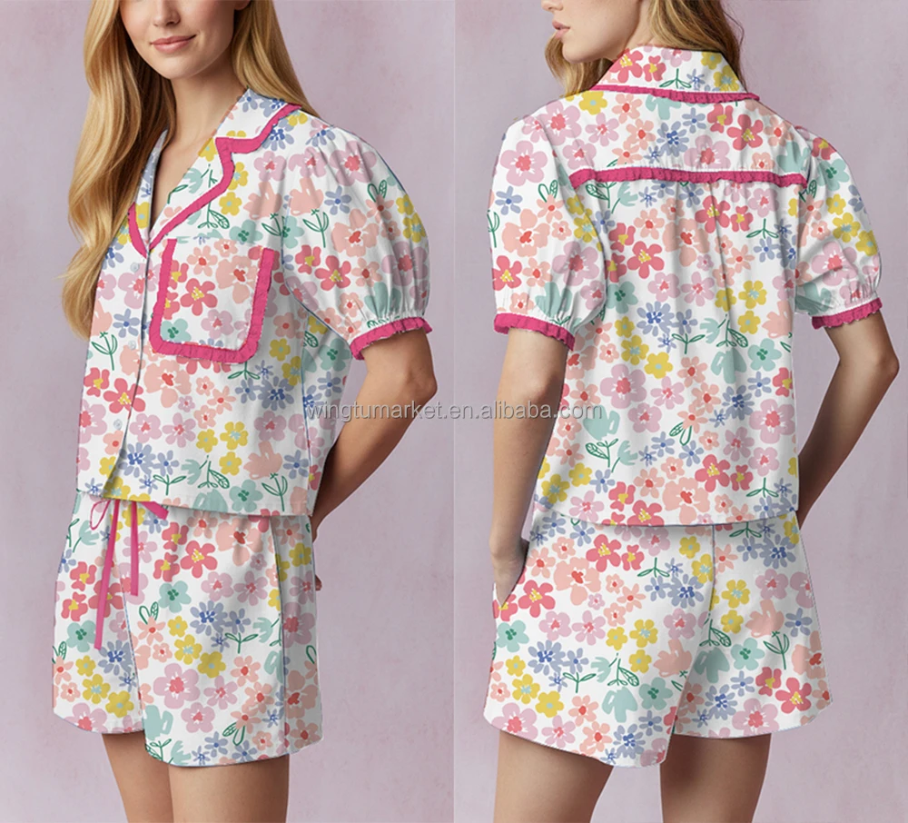 Pink Floral Print Hotpink Piping Short Sleeve Puff Sleeve Collar Shirt Pocket Top Shorts Two Piece Pajama Set Women