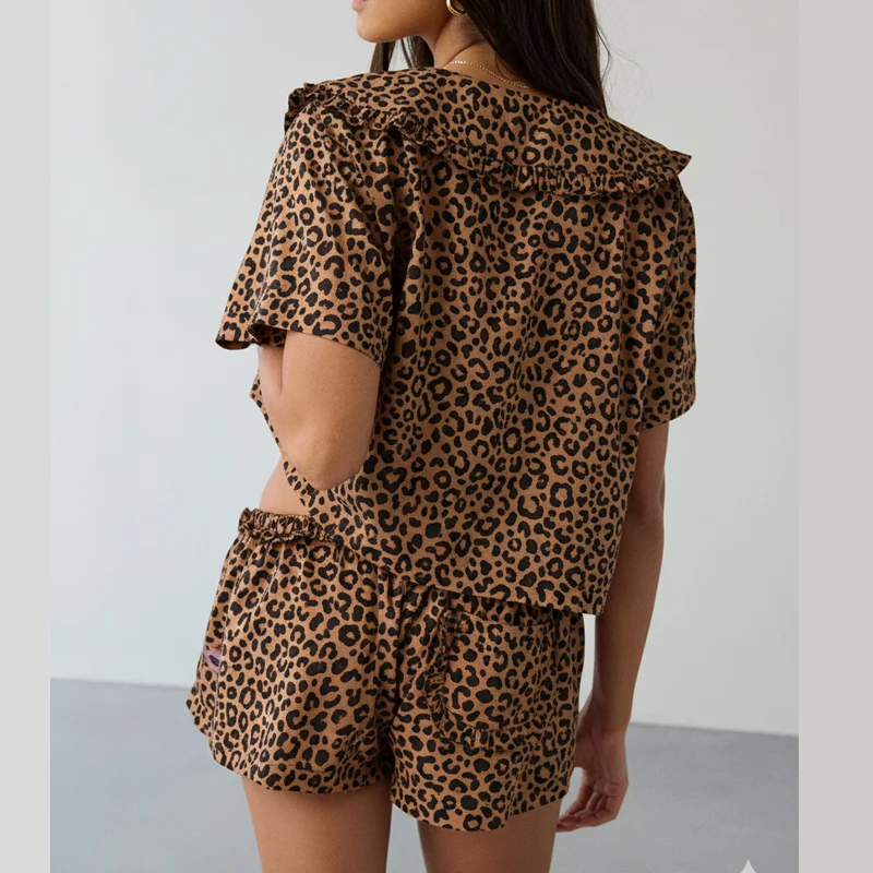 Summer Short Sleeve Sailor Collar V Neck Bow Tie Front Cardigan Shirt Top Shorts Two Piece Leopard Print Loose Pajama Set Women