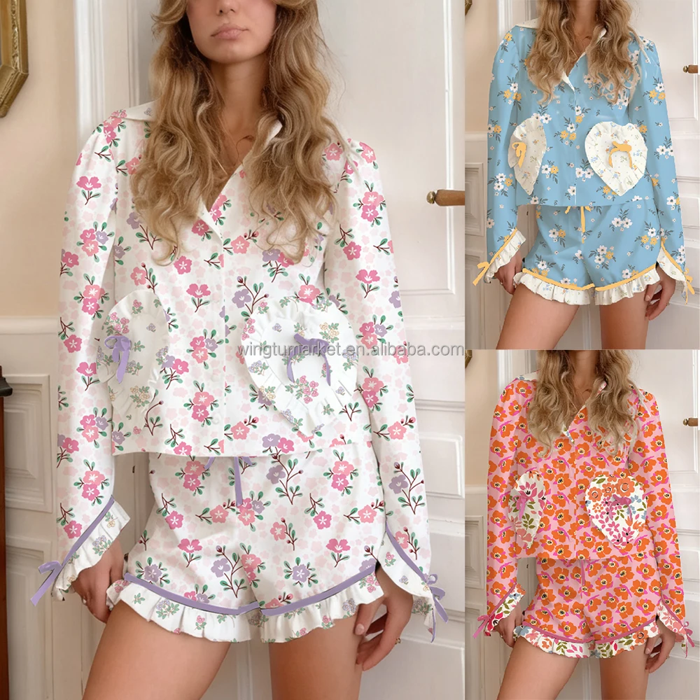 Spring Summer Orange Floral Print Long Sleeve Heart Pocket Shirt Collar Top Shorts Two Piece Pajama Set Women