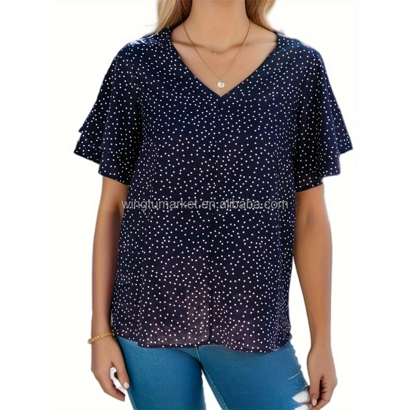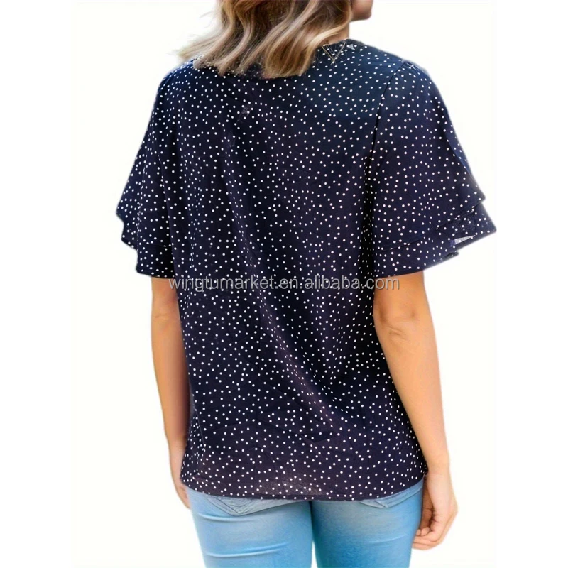 Wholesale Short Sleeve Tops Summer Shirt Tee v Neck Loose Casual Elegant Ruffled Chiffon Navy Blue Polka Dot Blouse Women