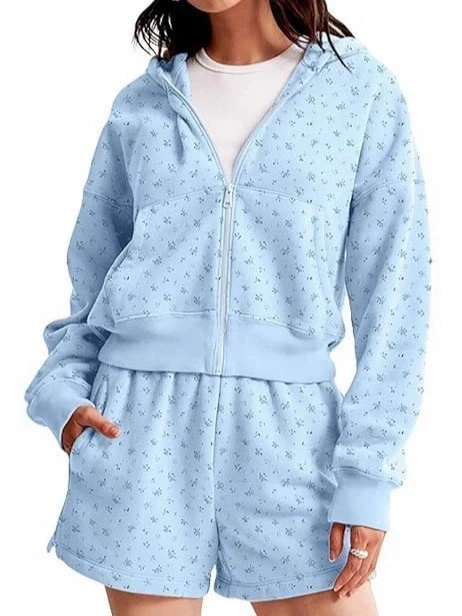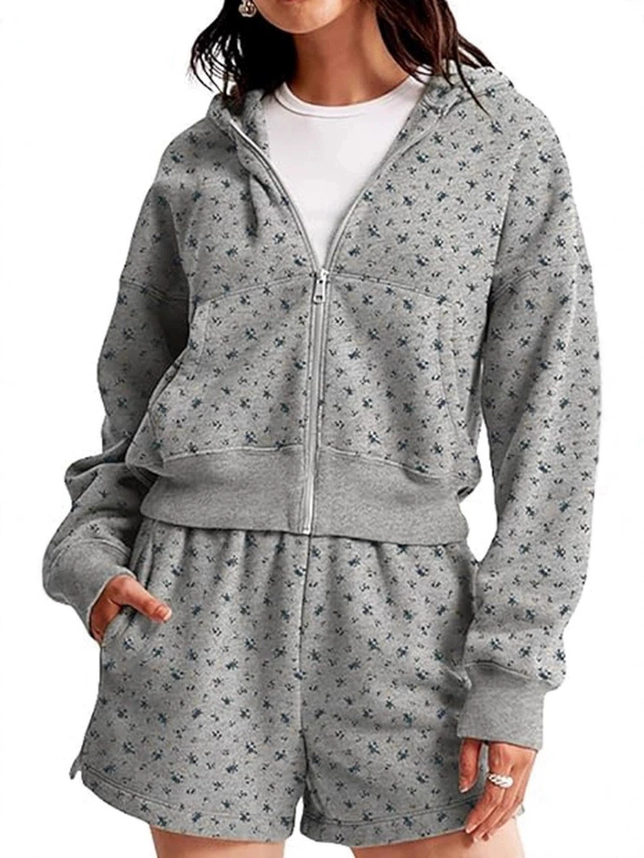 Custom Printed Casual Hoodie Zip up Rib Hem Long Sleeve Cardigan Shorts Plus Size Tracksuit Women
