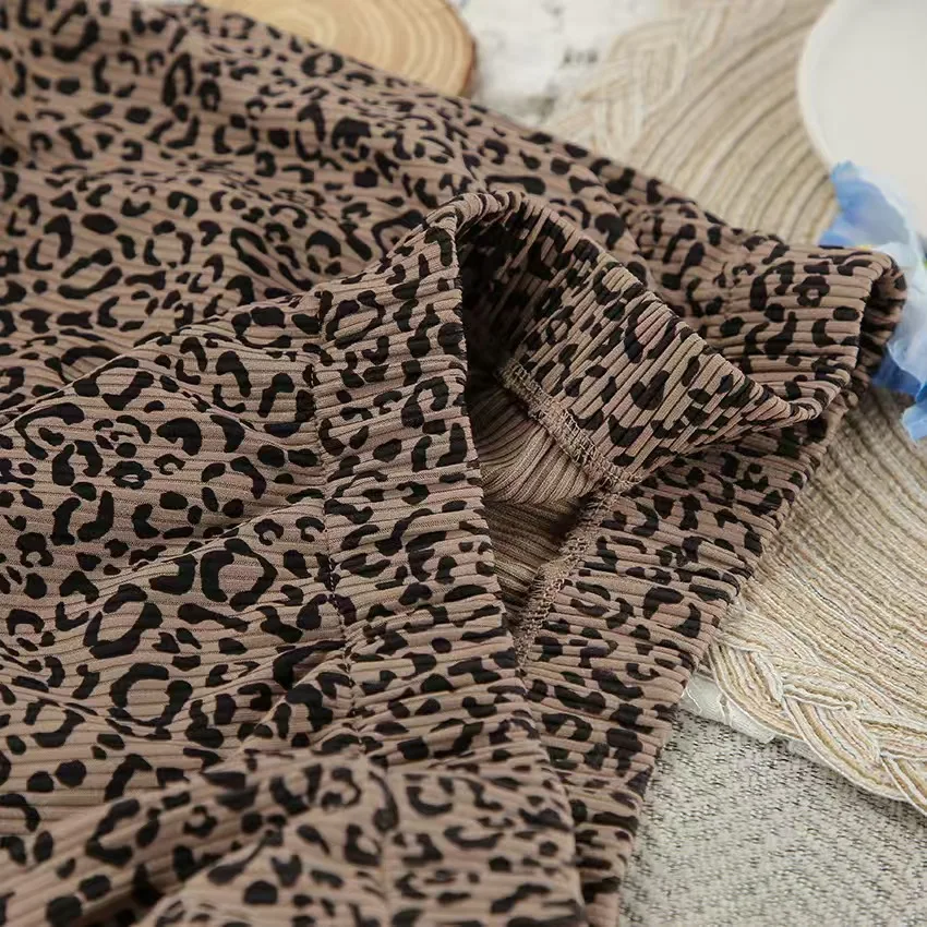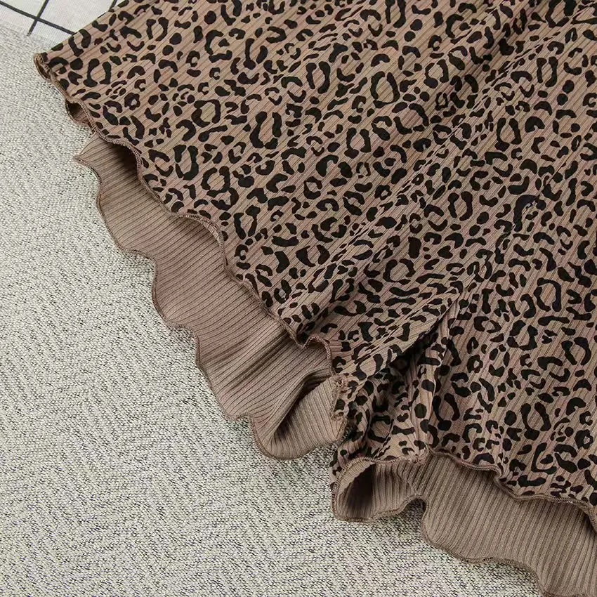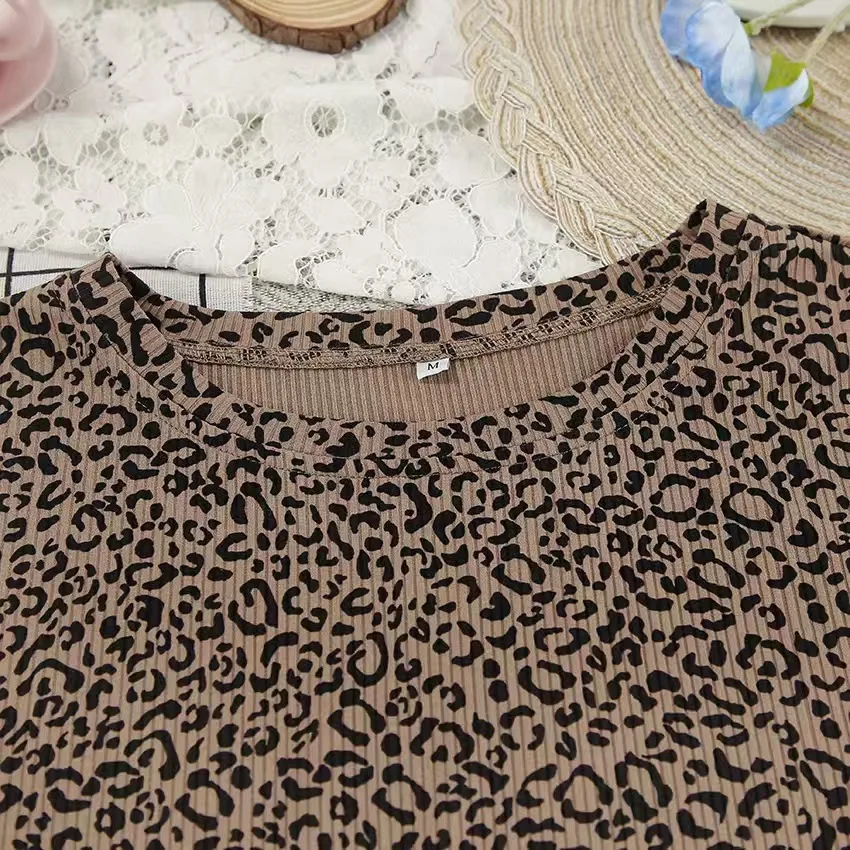 Summer Lightweight Breathable Leopard Print Short Sleeve Crew Neck Ribbed Ruffle Hem Two Piece Pajama Set Women