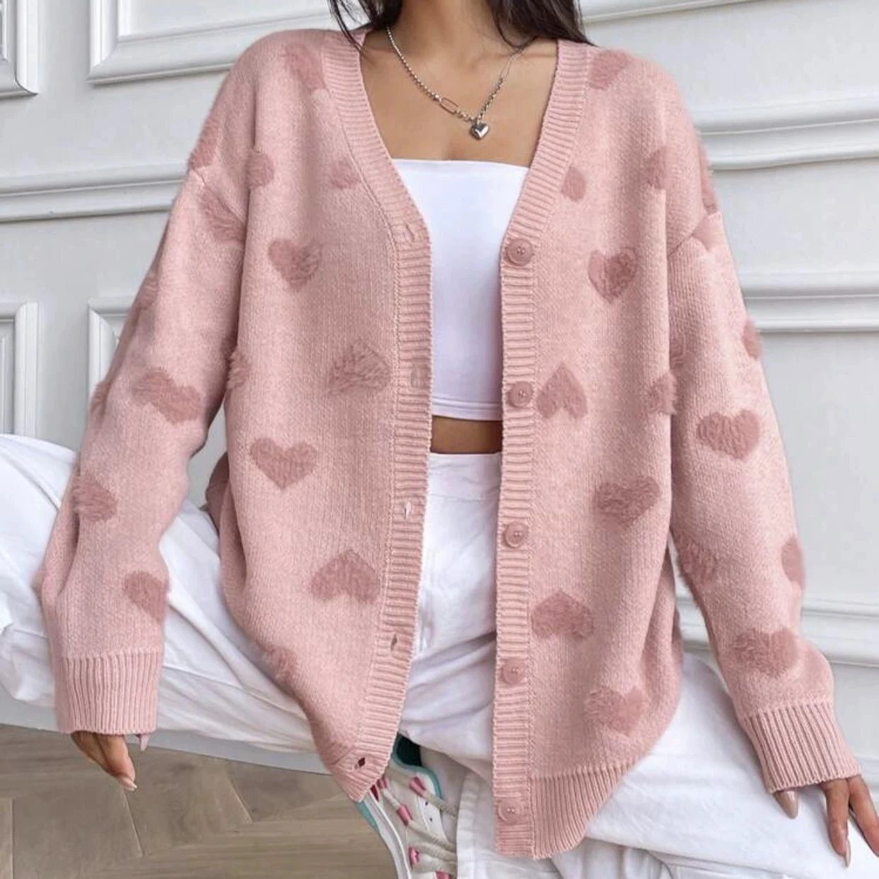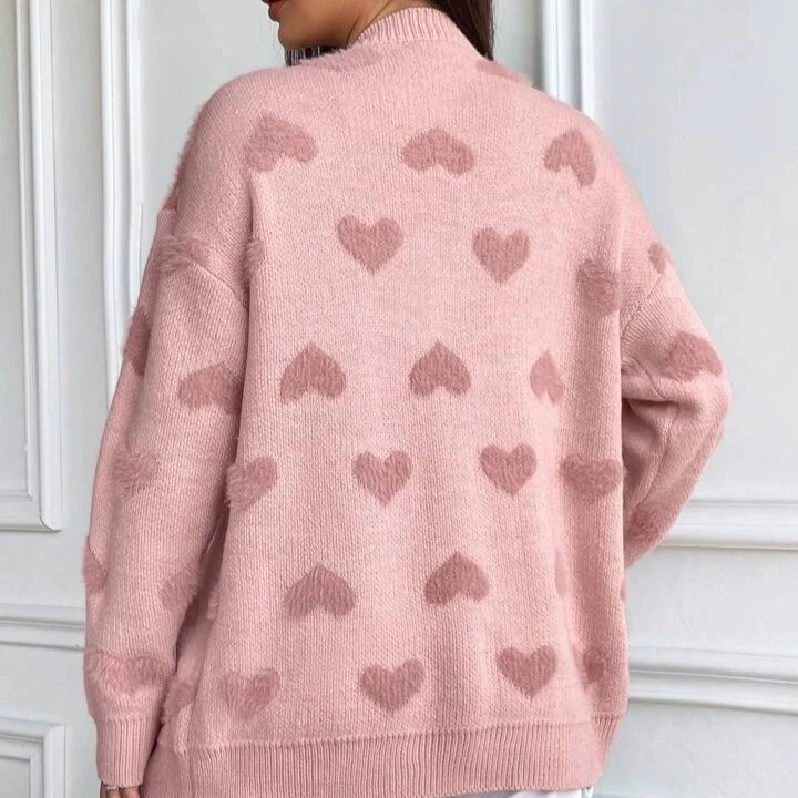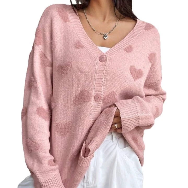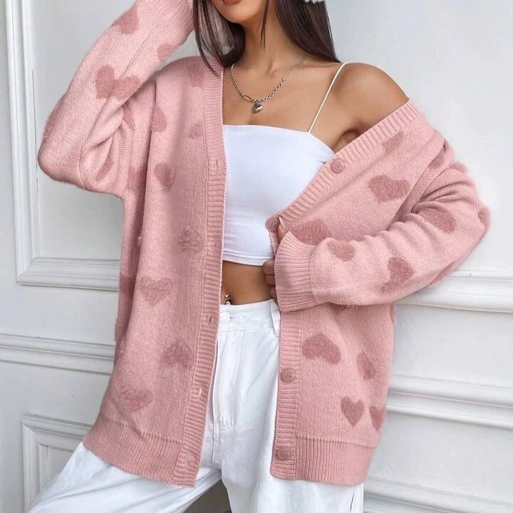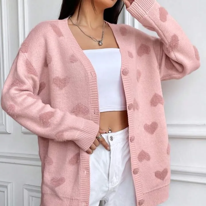 Valentine Pink Heart Jacquard Long Thick Button Front Casual V Neck Knit Cardigan Sweater Women