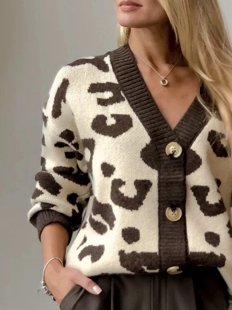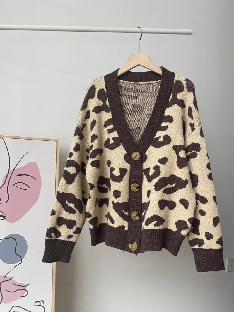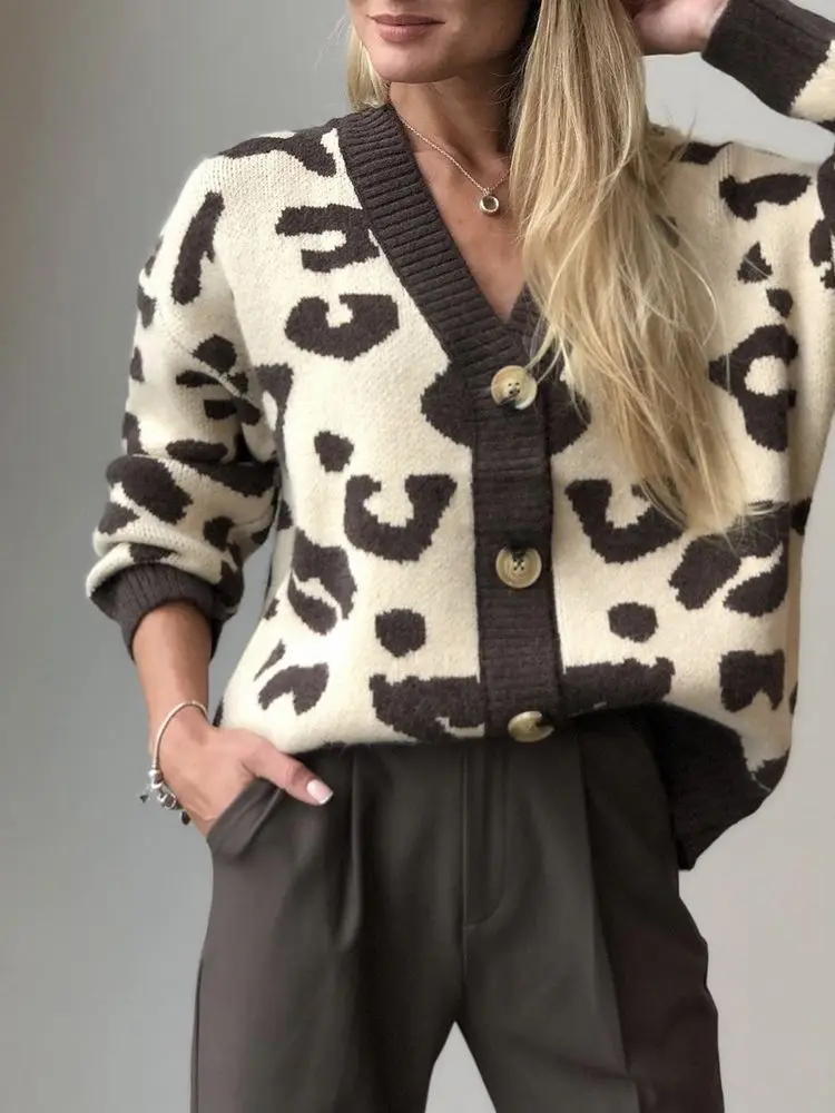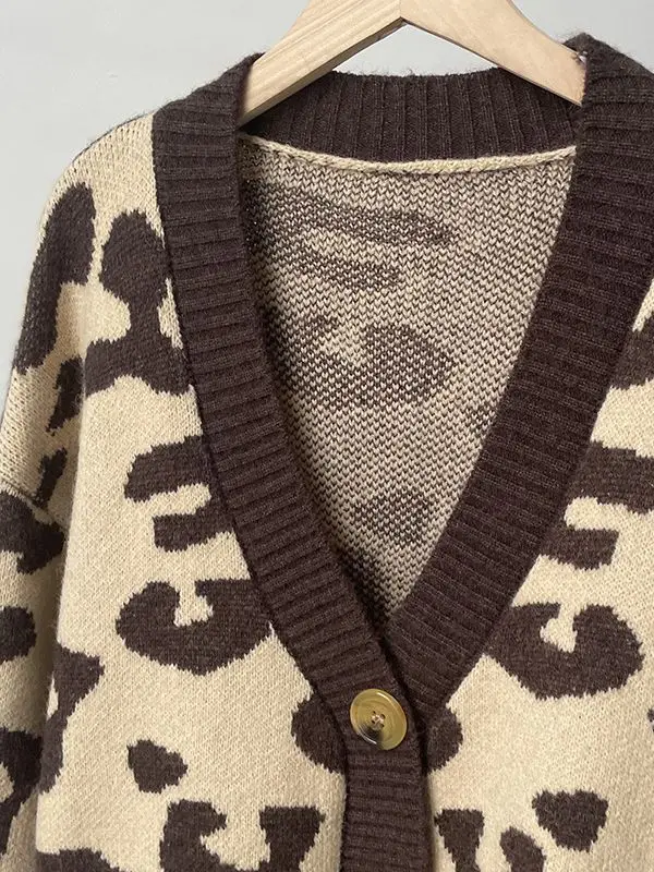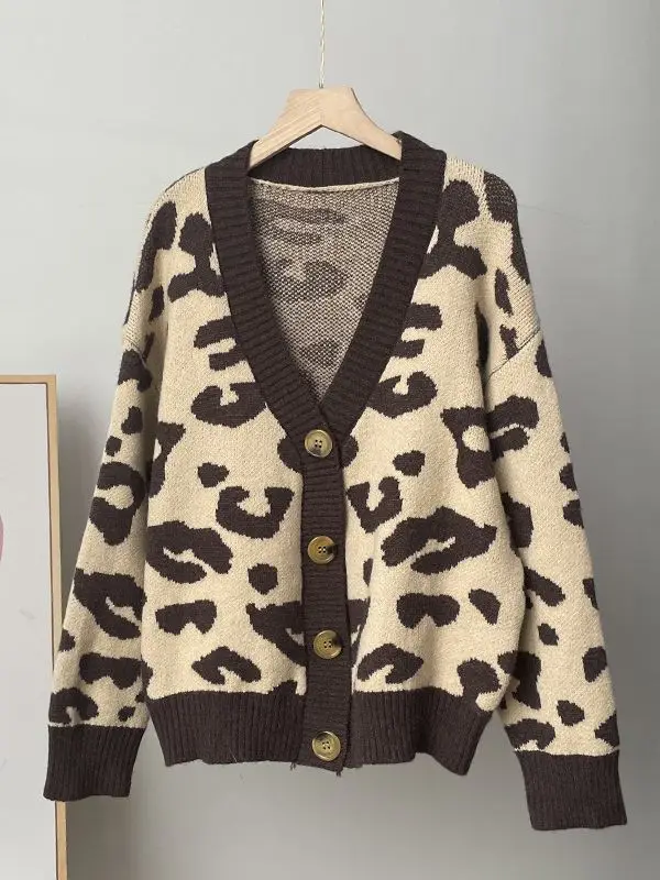 Fall Winter Lazy Style V Neck Leopard Jacquard Loose Fit Long Sleeve Plus Size Cardigan Knit Sweater Women