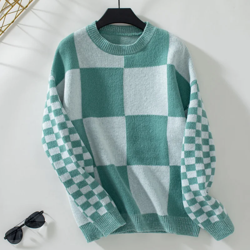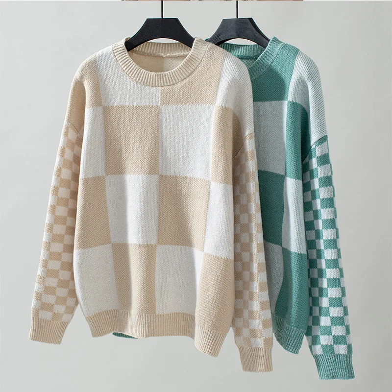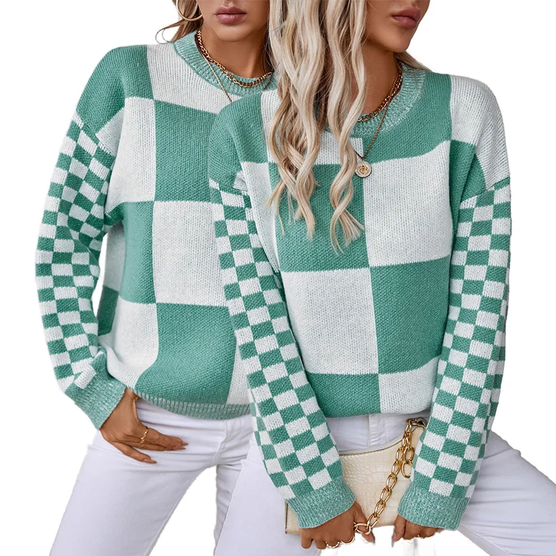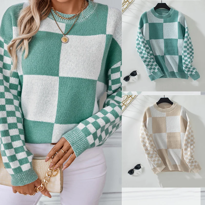 Wholesale Winter Round Collar Pullover Bicolor Blocking Plaid Pattern Long Sleeve Jumper Knitted Checkerboard Women Sweater