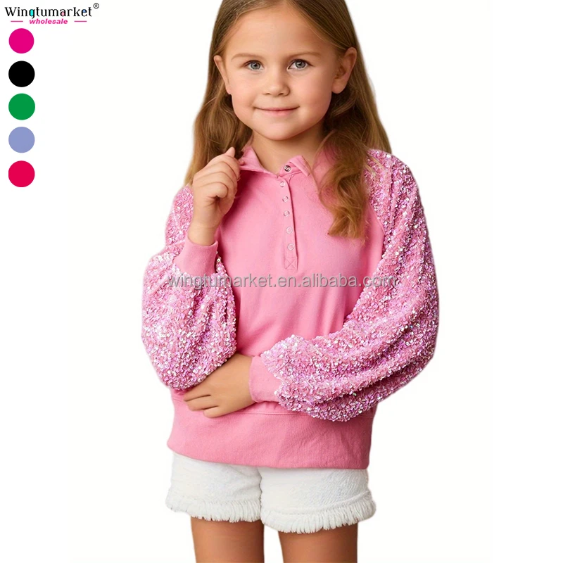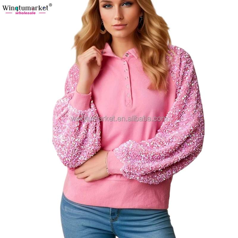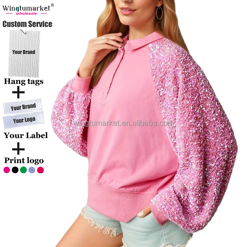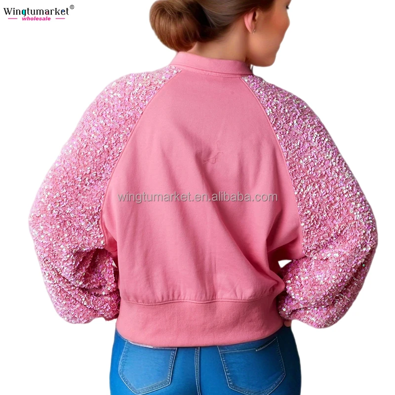 Manufacturer Female Collar Sweatshirts Sequined Raglan Sleeve pink Oversize Custom Sequin Sweatshirt Women