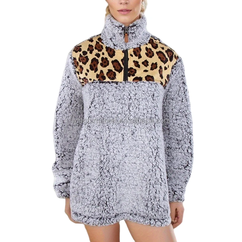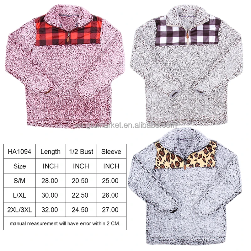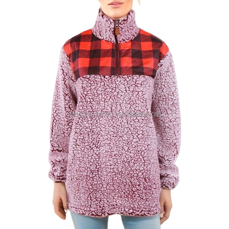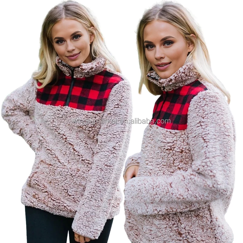 Wholesale Fleece Sweatshirts Red Bufflo Plaid Fur Tops Leopard Long Sleeve Half Zip Sherpa Jacket Pullover Sweatshirt for Women