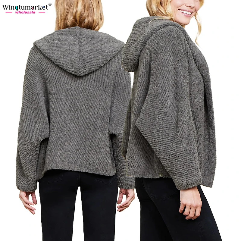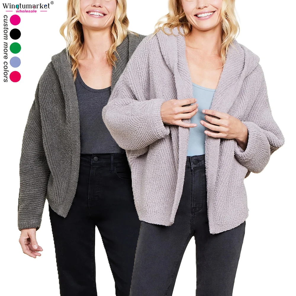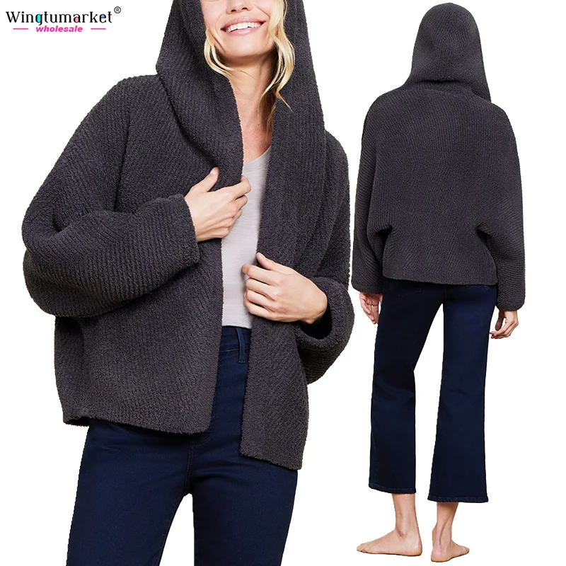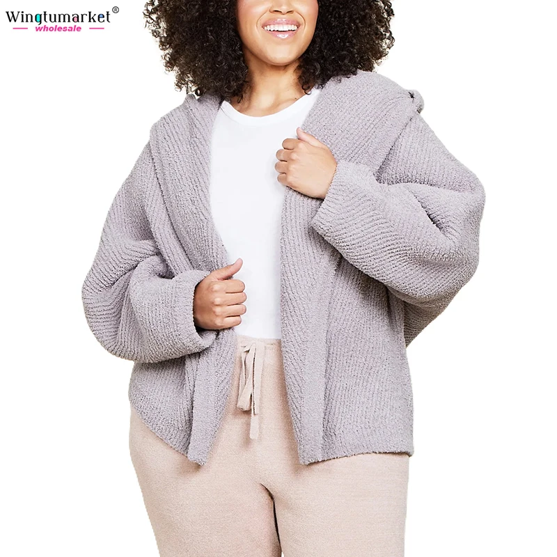 Custom Knitted Cardigans Sweater Ladies Hooded Rib Microfiber Soft Warm Dolman Sleeves Plus Size Fuzzy Oversized Cardigan Women