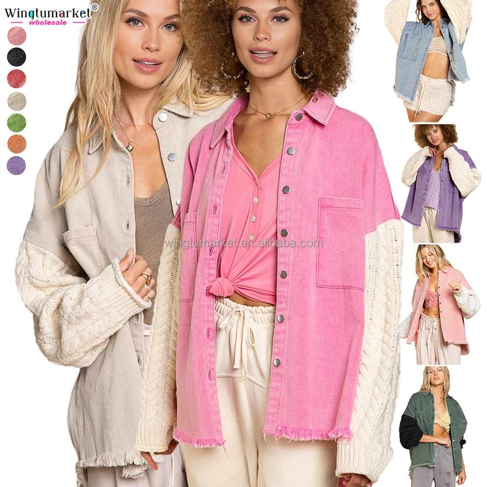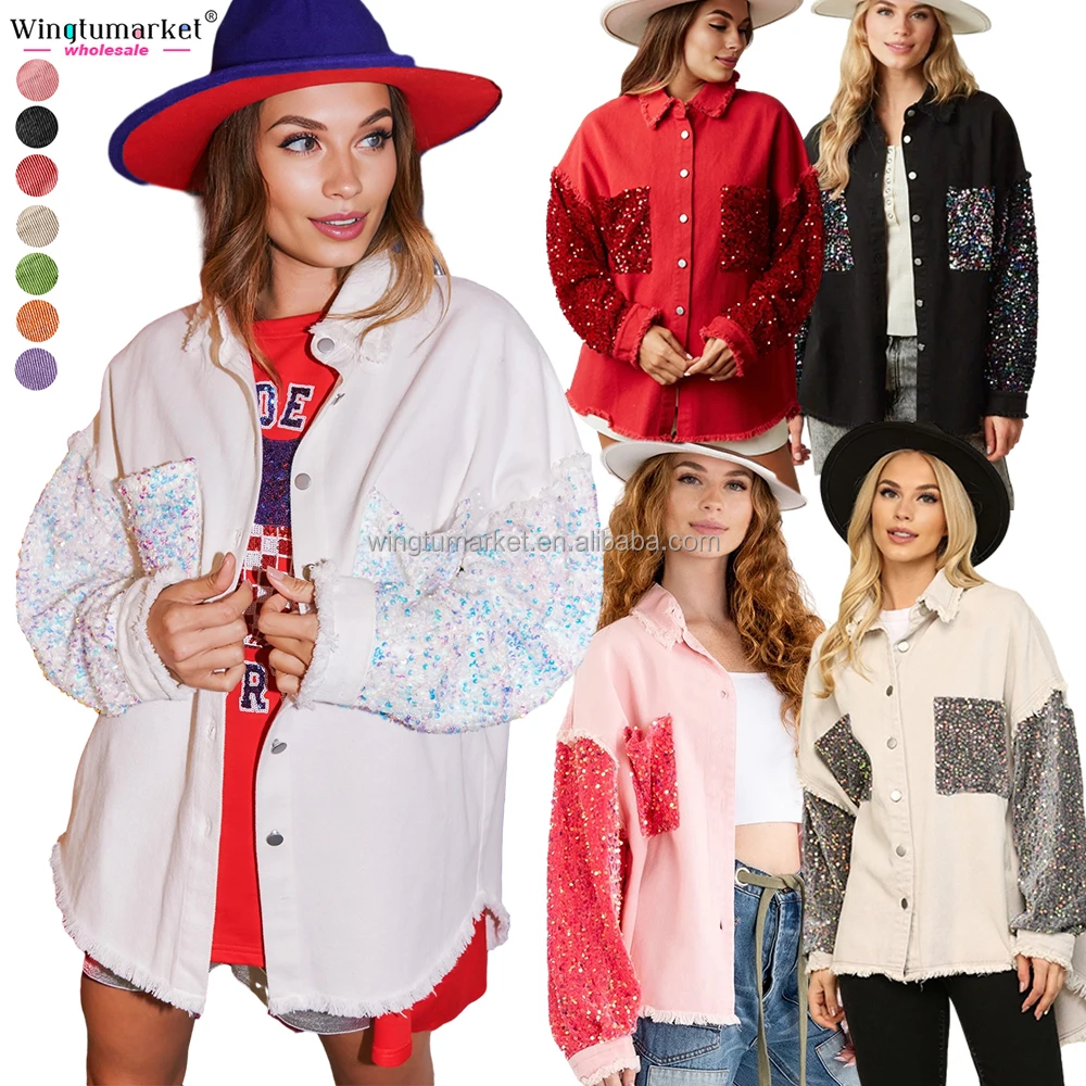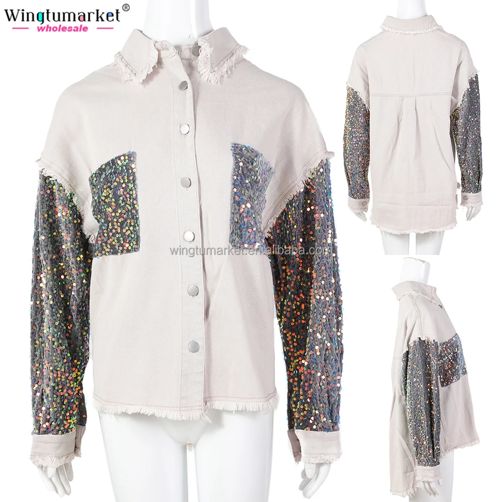 Custom Jean Jacket Woman Knit Crochet Long Sleeve Fringe Acid Washed Distressed Sequin Jackets Denim Shackets for Women