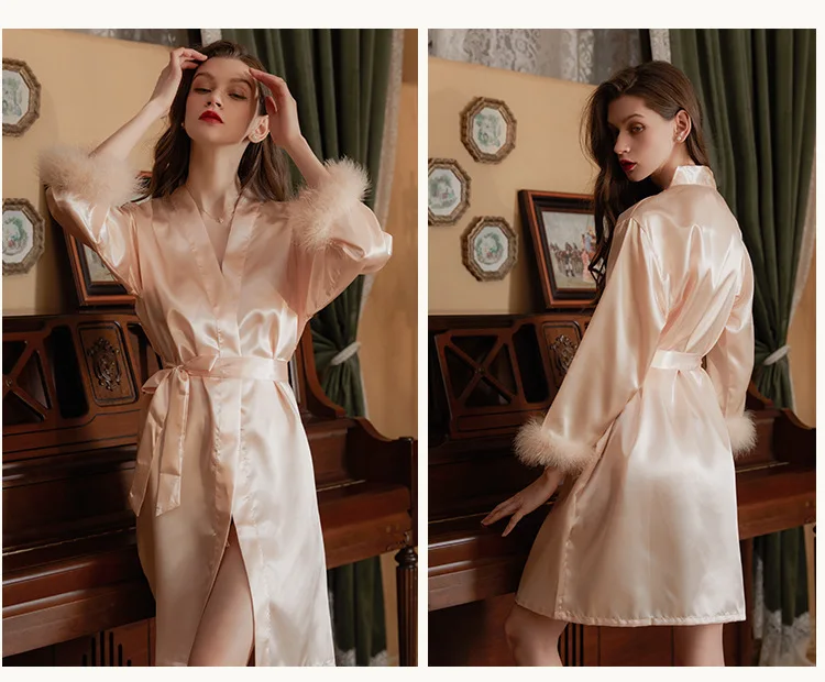 Wholesale Satin Bathrobe Designer Feather Robes Long Sleeve Wedding Marriage Bridal Bridesmaid Robe Femme