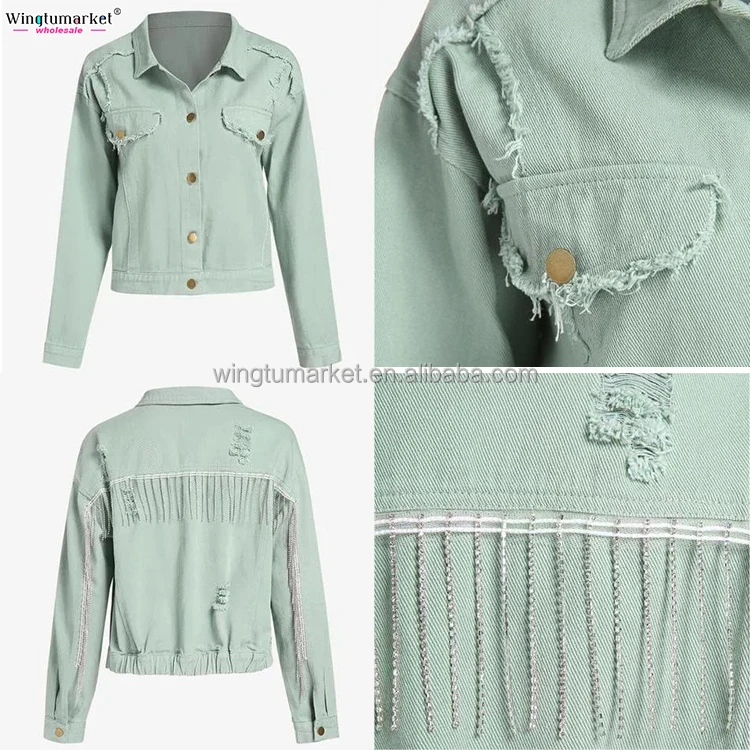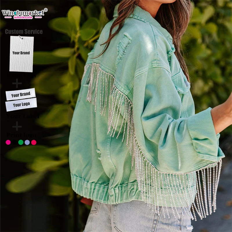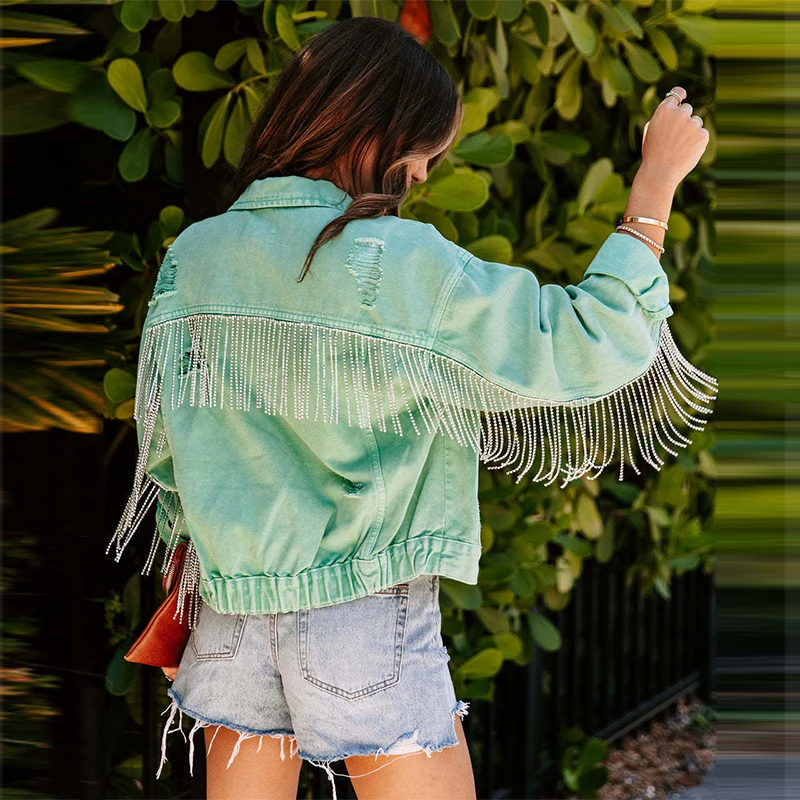 Vintage Woman Jacket Mint Green Chain Metal Diamante Tassel Rhinestone Fringe Ripped Distressed Denim Jackets for Women