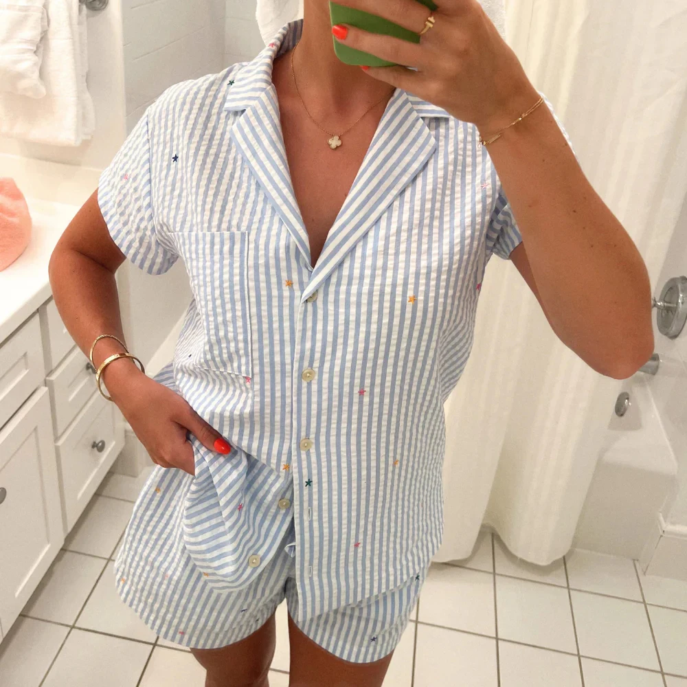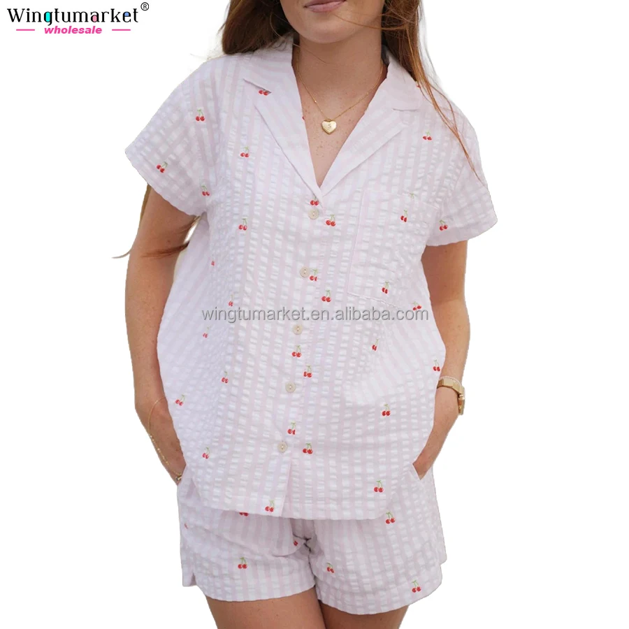 Custom logo Valentine Pajamas pink Blue Stripe Seersucker Embroidery Cherry Hearts Stars Loungewear Women Sets