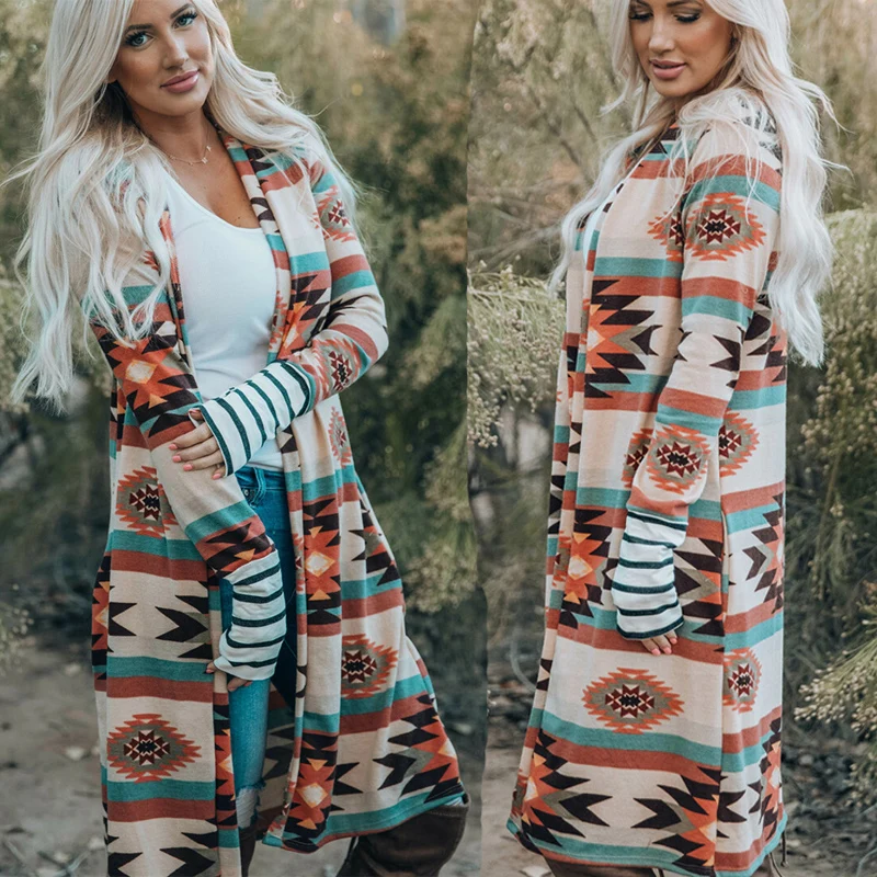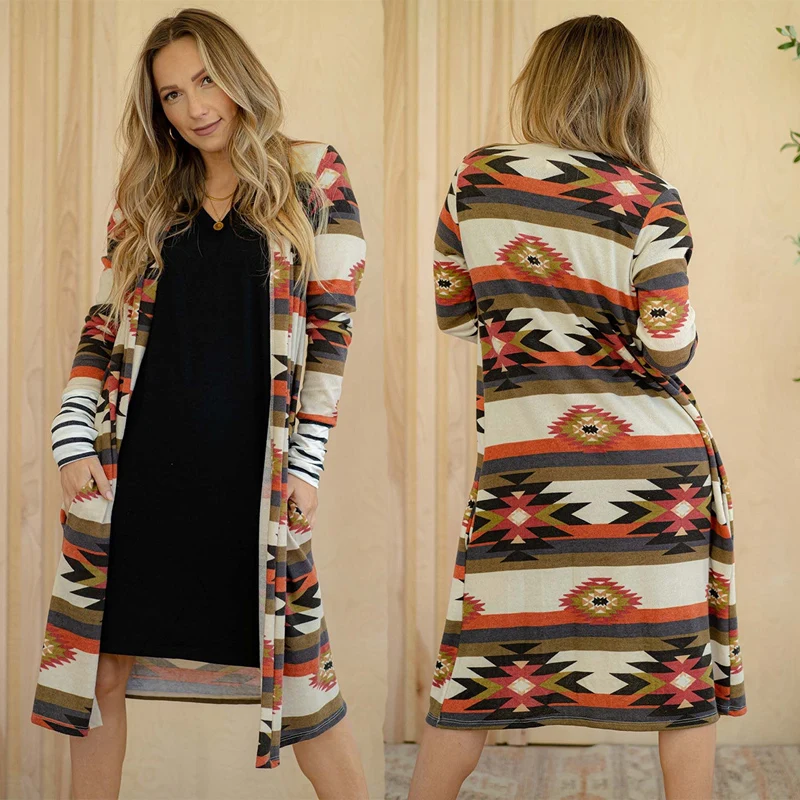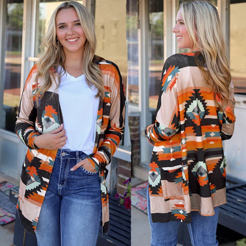 Megan Aztec Rodeo Style Cardigan Color Block Open Front Western Ethnic Pockets Coating Kint Tribal Boho Geometric Print Jacket