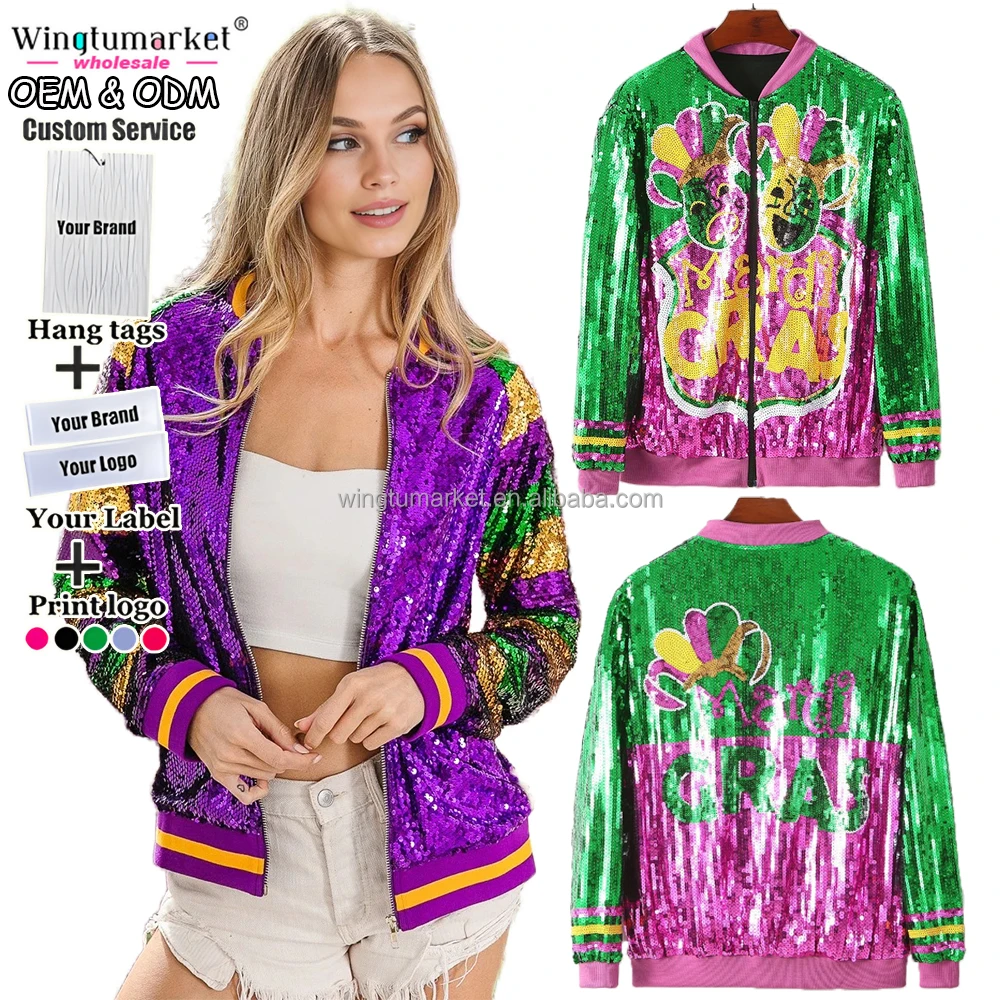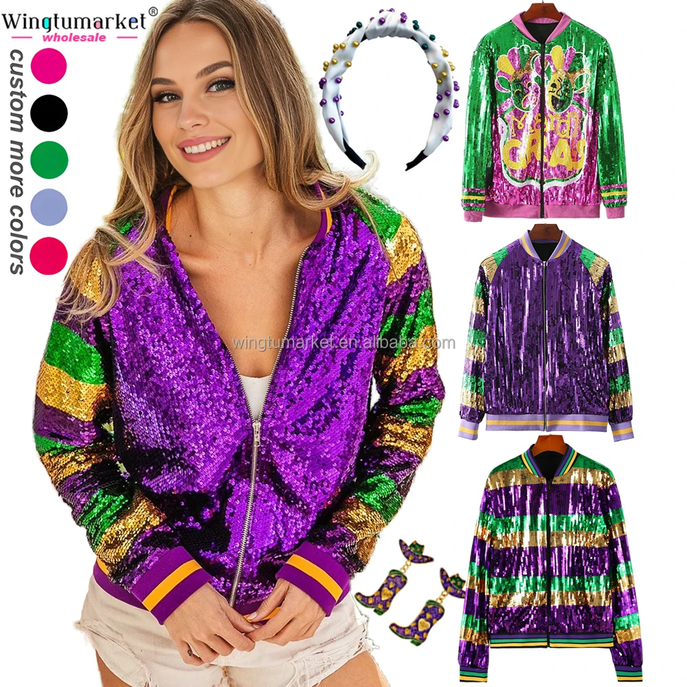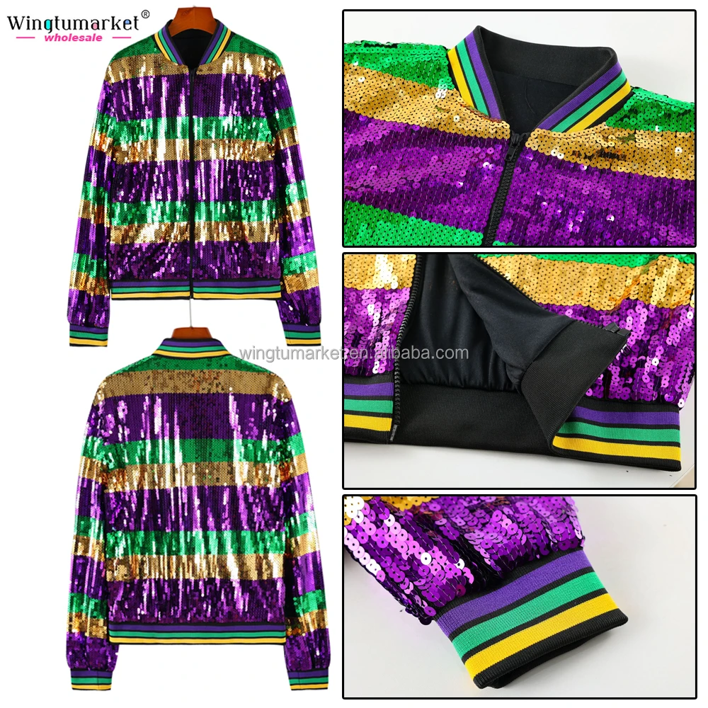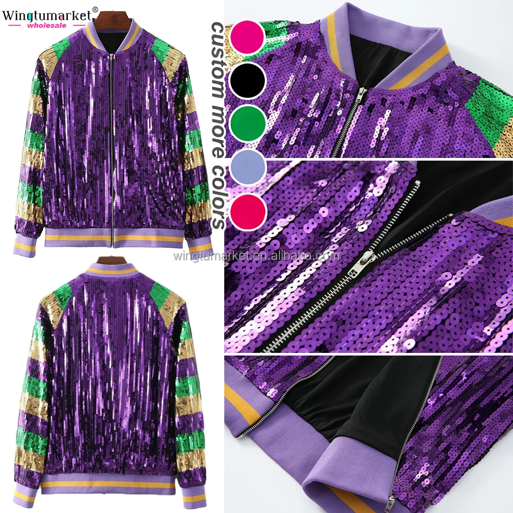 RTS Mardi Gras Apparel Sequins Bomber Jacket Purple Stripe Ribbed Zipper Glitter Woman Coats Sequin Jackets for Women