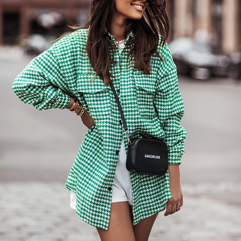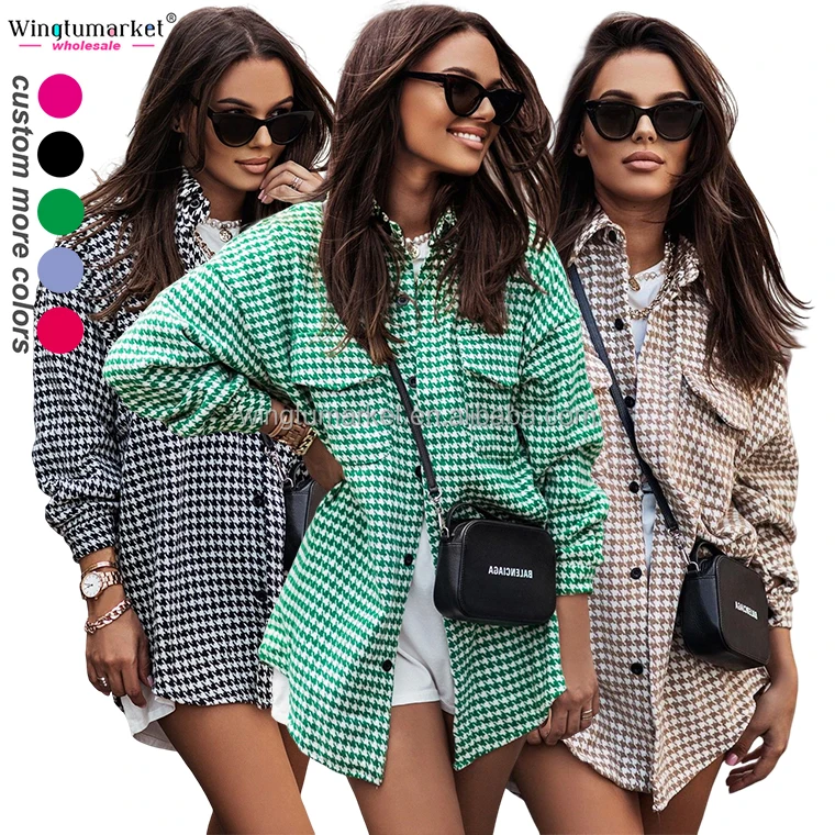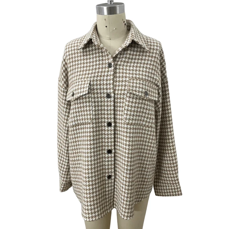 Fall Winter Tweed Jacket Ladies Lapel Button Down Pocketed Outdoor Coats Houndstooth Plaid Shackets Jacket for Women