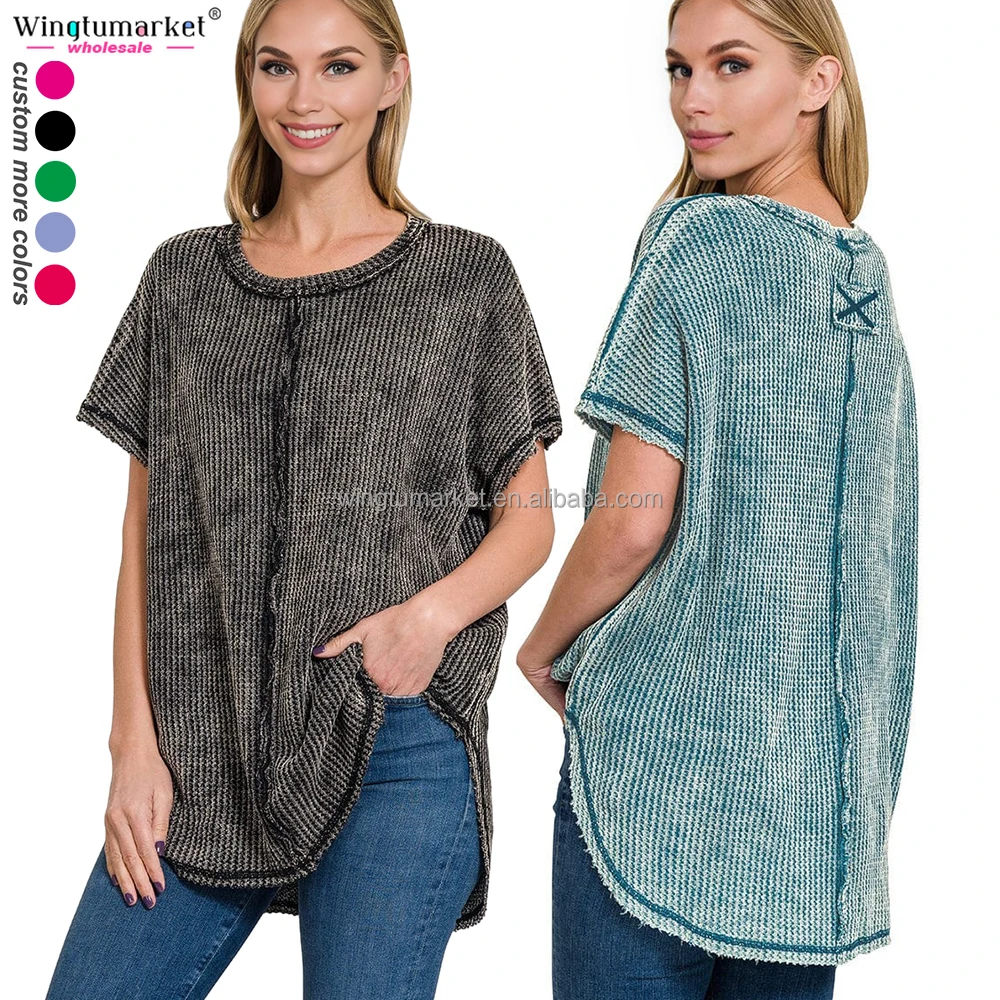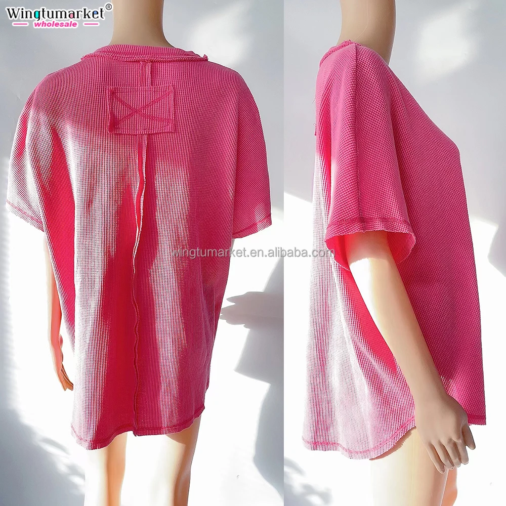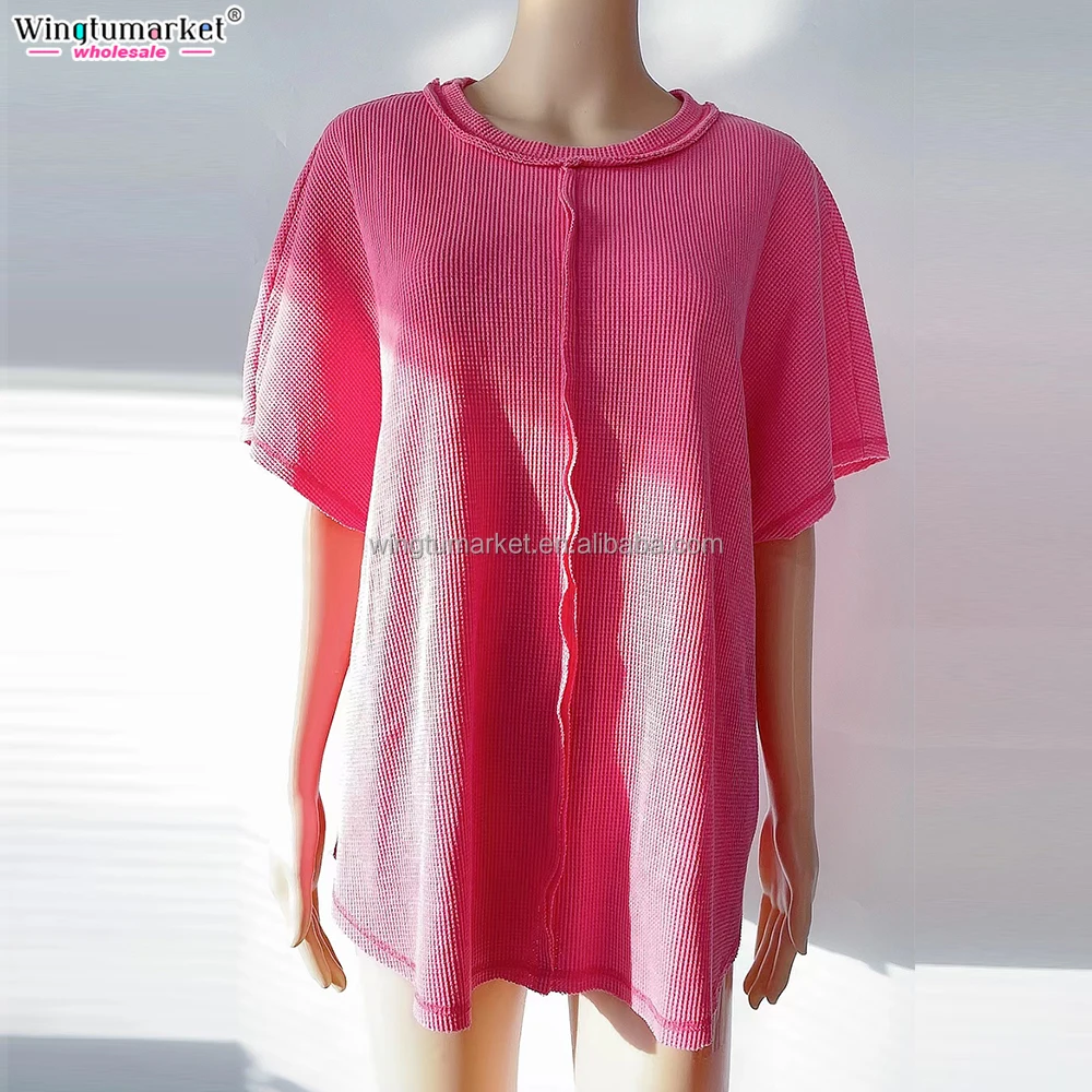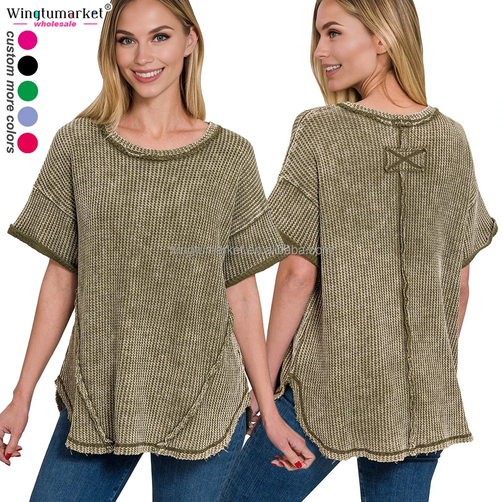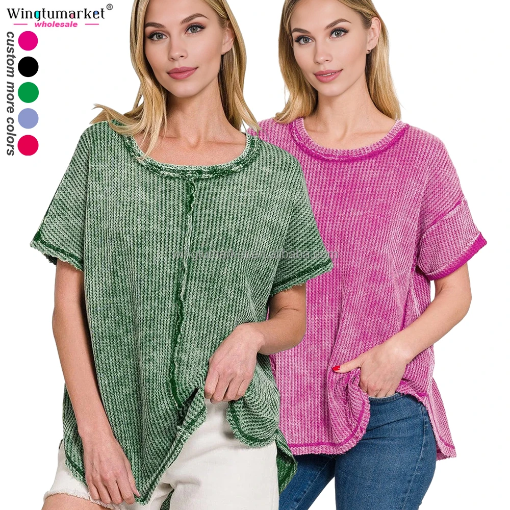 Wholesale Woman Tops Patchwork Oversized Rolled Short Sleeve Waffle Custom t Shirt Blouses Acid Wash Shirts for Women