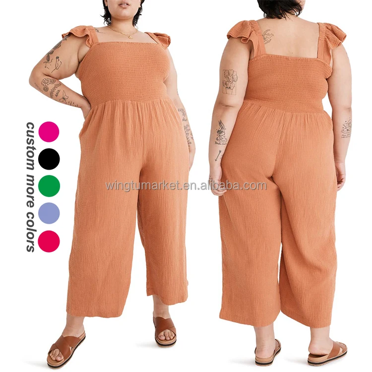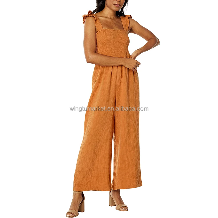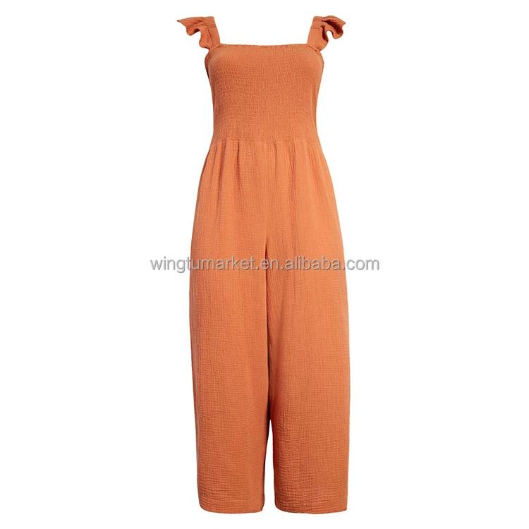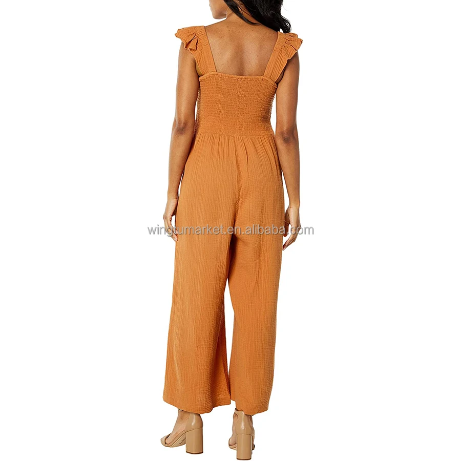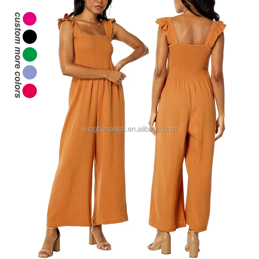 OEM Stretchy Smocked Rompers Ladies Long Wide Legs Flutter Sleeve Breathable Cotton Muslin Solid One Piece Jumpsuit Women