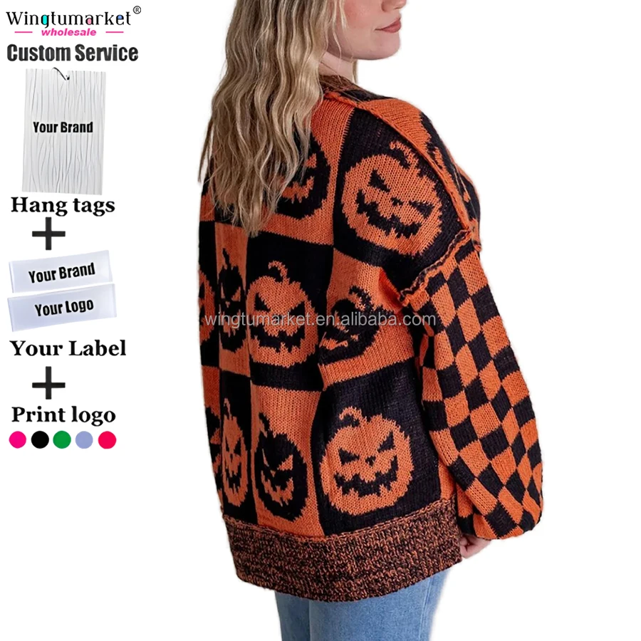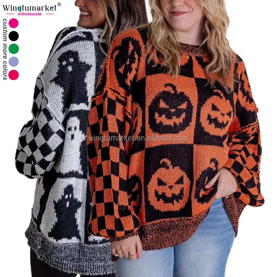 Custom Halloween Sweaters Spooky Season Jumper Checkered Ghost Jack O Lanterns Pumpkins Knitted Sweater for Women