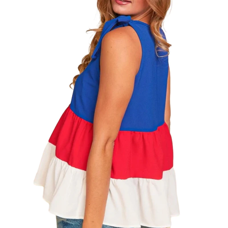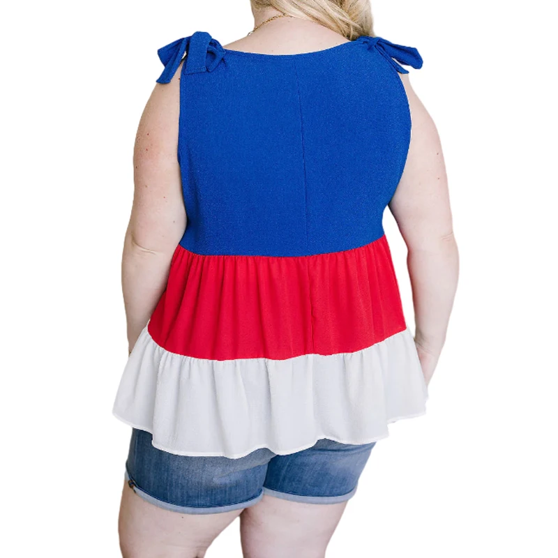 Wholesale USA Theme T Shirt Colorblock Red Blue White V Neck Ruffle Hem Patriotic Tiered Shoulder Tie Strap Bow Tank Top Women