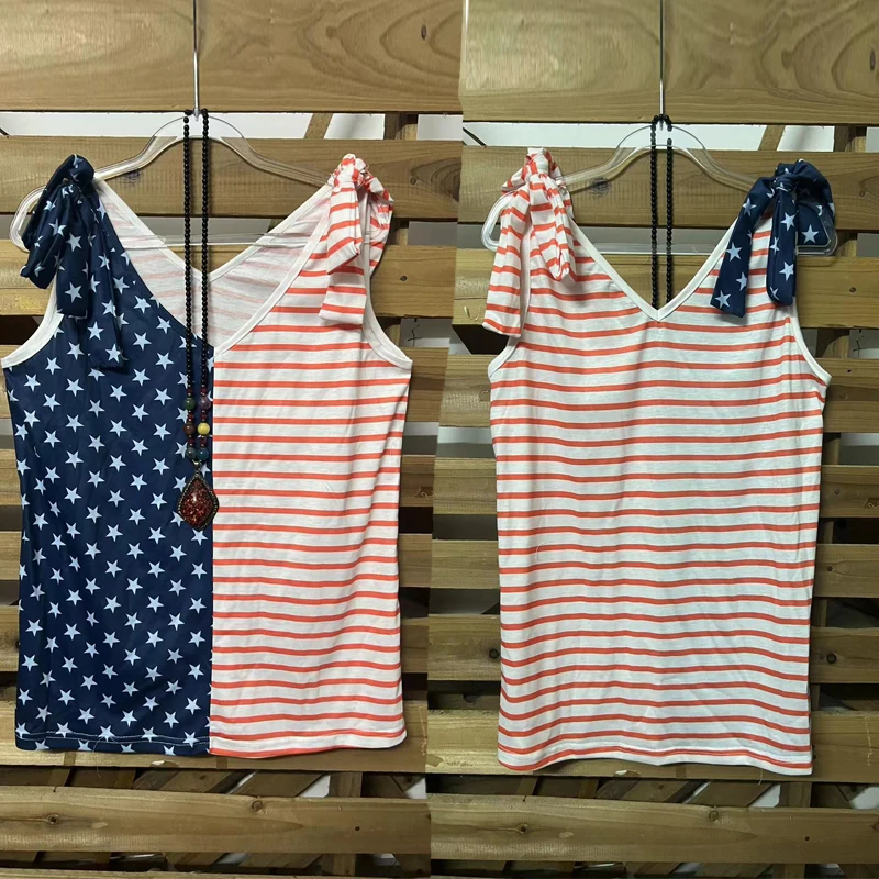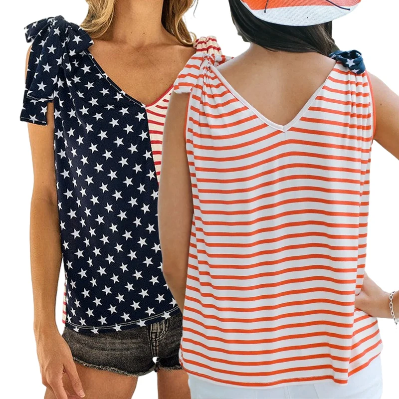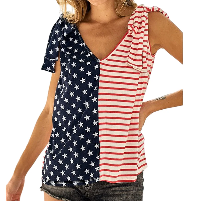 Summer Usa Theme t Shirts Sleeveless Shoulder Ribbon Tie v Neck Patriotic Top Independence Day Shirt American Flag tank Top